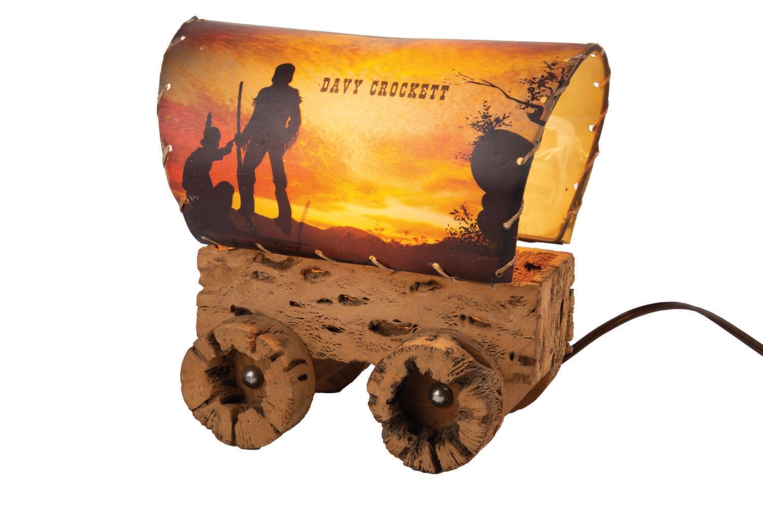 (Cactus Craft, 1950s) An unusual, covered wagon table lamp produced by Cactus Craft of Arizona in the 1950s. The 4"x8"x7" tall wagon has a light bulb socket mounted in the center of the dried cactus body. Die-cut cardboard forms the wagon cover and features colorful imagery that glows when lit. In very good condition with some fading to the imagery. The lamp has been tested and works well.