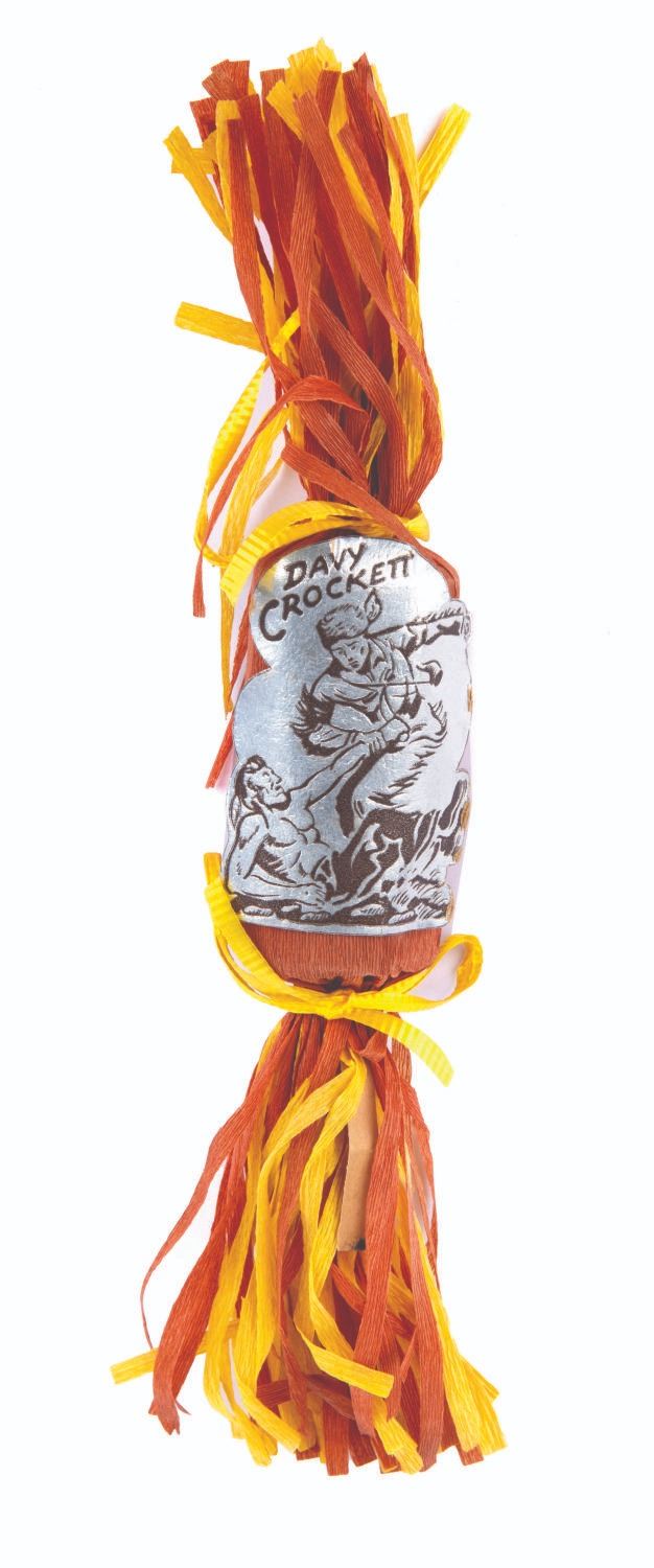 (1950s) A very unusual Davy Crockett party cracker. "Christmas" crackers from the United Kingdom are a party favor that consists of a wrapped and decorated cardboard cylinder that produces a loud bang when pulled apart and releases small trinkets or toys. This example is from the height of the Crockett craze in England or possibly another Commonwealth country. We can think of no truer example of ephemera, a collectible that was meant to exist for only a short time, than this Crockett cracker. Measuring 9" x 1.5", the cracker is in fine condition with light wear to the edge of the Crockett emblem and fading. The cracker's contents are unknown, and the cracking function is, of course, untested.
