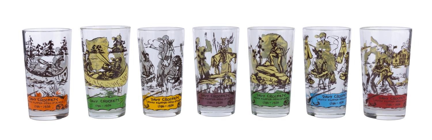 (Davy Crockett, 1950s-60s) A collection of seven Davy Crockett Indian Fighter drinking glasses by an unknown manufacturer. Measuring 5" tall and 2.75" in diameter, each cup is in very good to fine condition with no signs of chipping or wear to printed graphics.