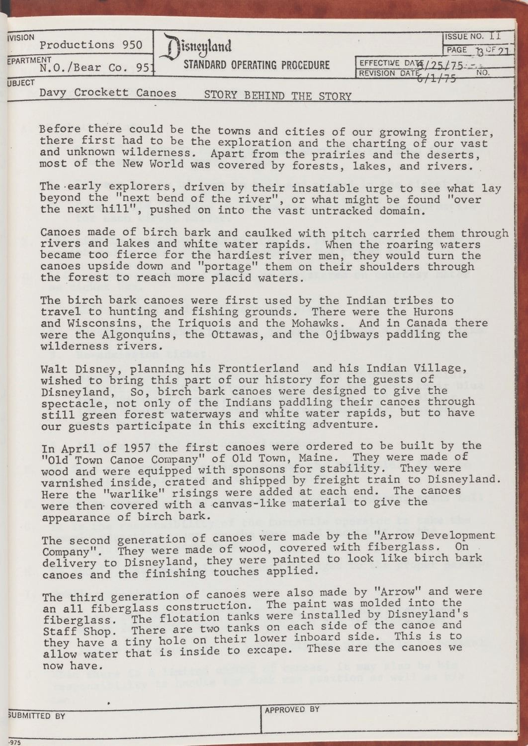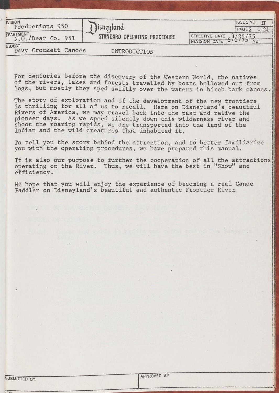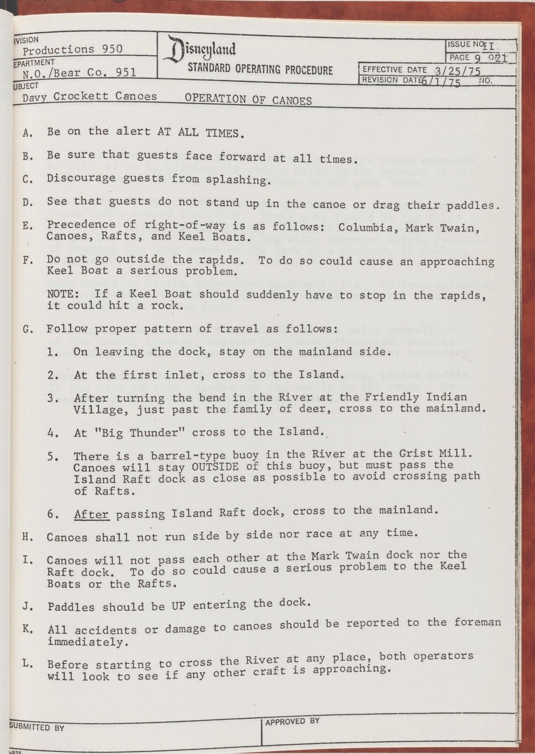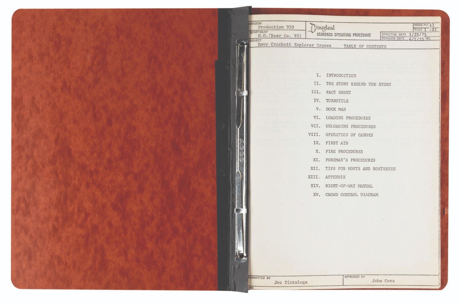 (Disneyland, 1975) A Davy Crockett Explorer Canoes manual outlining in detail the story behind the canoes and Rivers of America, as well as operating procedure for Cast Members. Measuring 9” x 11.5”, the 21-page manual is in fine condition.