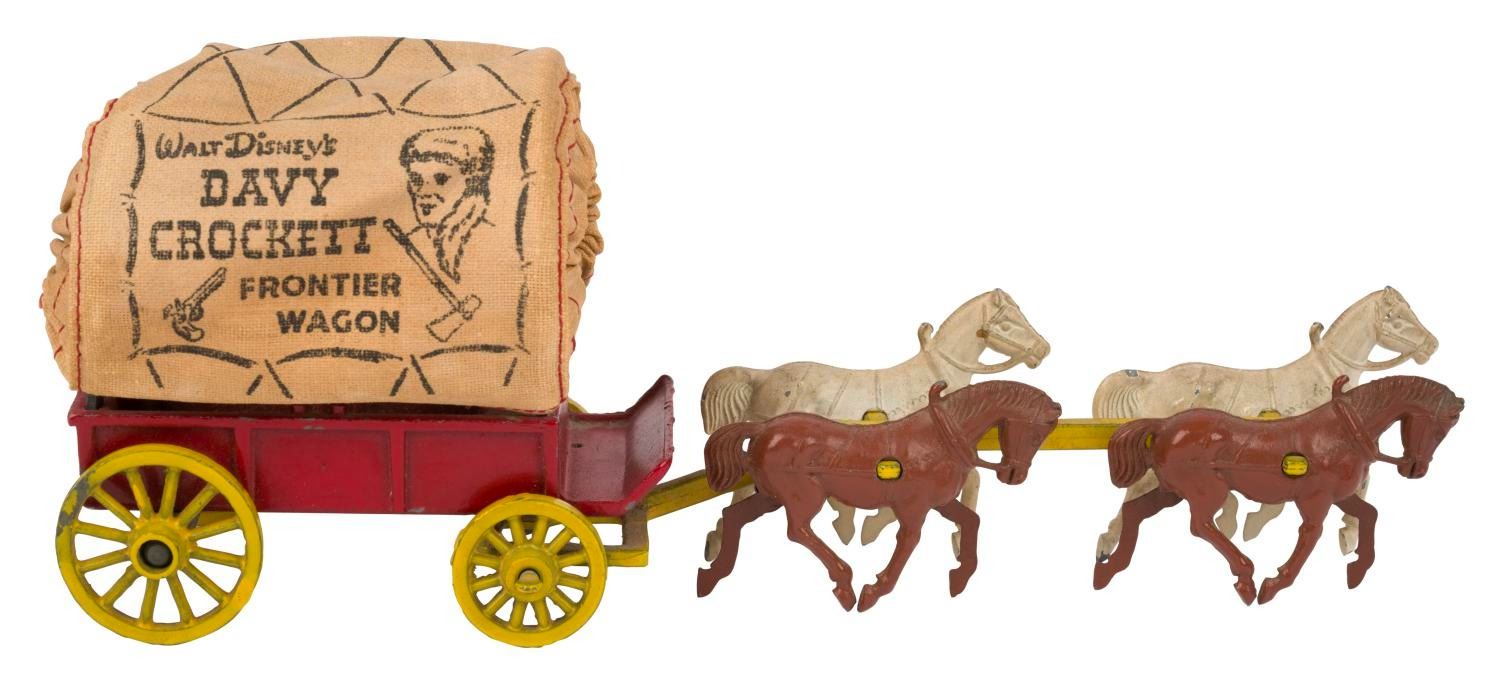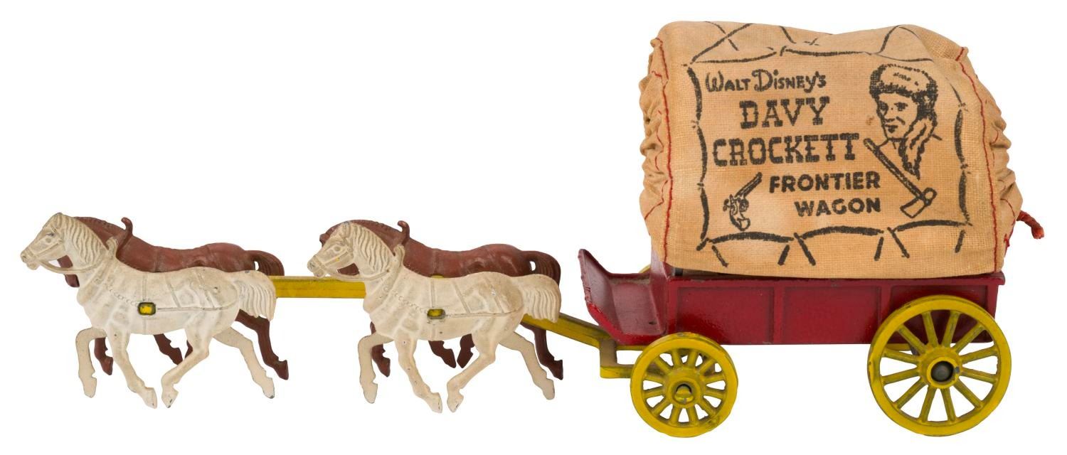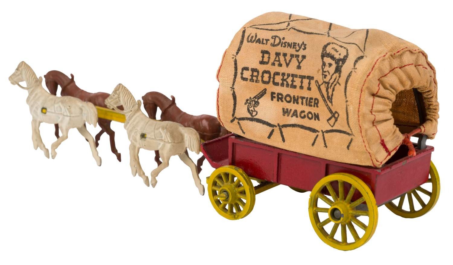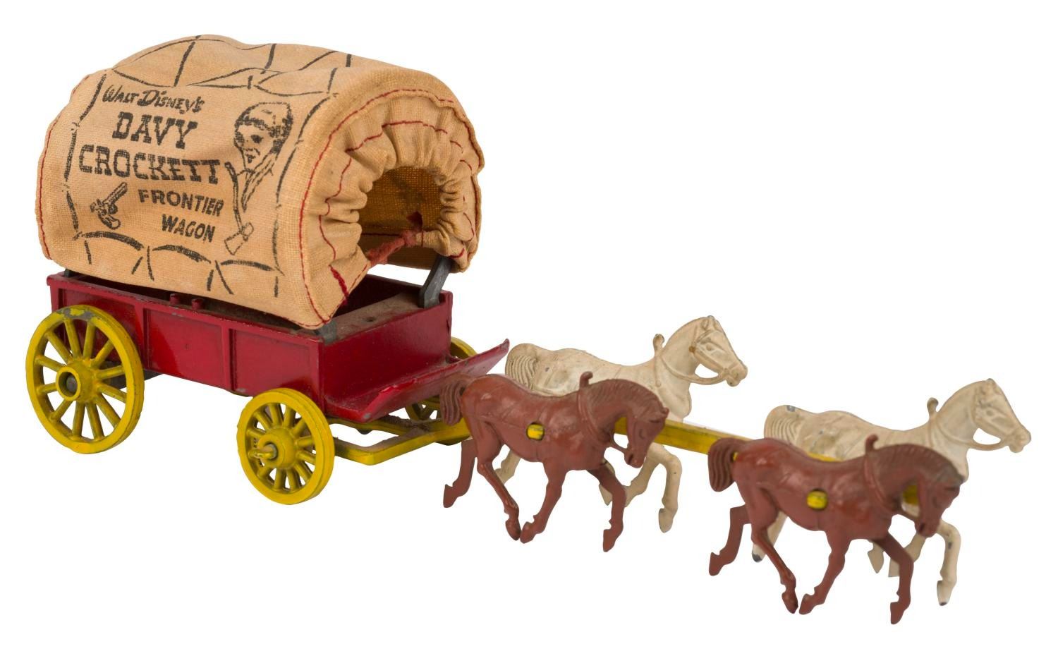 (Morestone, 1956) An Official Walt Disney's Davy Crockett Frontier Wagon toy. Morestone released five variations of the Covered Wagon toy in England. This version features a red metallic wagon, yellow wheels, and a four-horse hitch, with a cloth wagon canopy. Measuring 7.5" x 2.25" x 3" tall, the toy displays in very good condition, with a missing driver figure, whip, and barrels, and slight wear to the painted pieces.