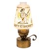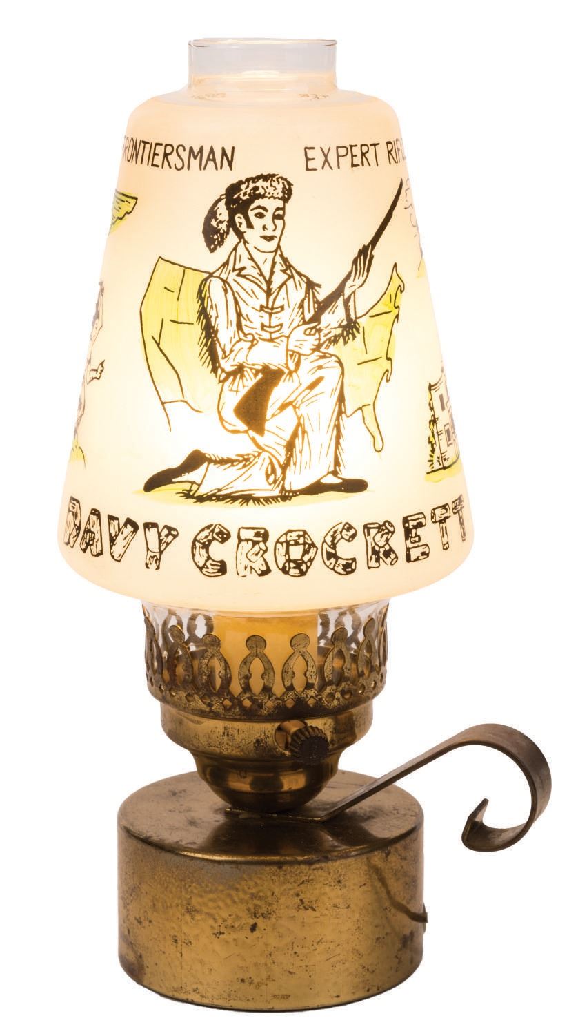 (1950's) A Davy Crockett lamp styled to look like an old-fashioned gas lamp, with brass base and white power cord. The hurricane glass style top illustrates great moments in Crockett's life. Measuring 5" at widest diameter and 12" high, the lamp is in very good working condition with wear from use and display and spotting to the brass finish of the base.