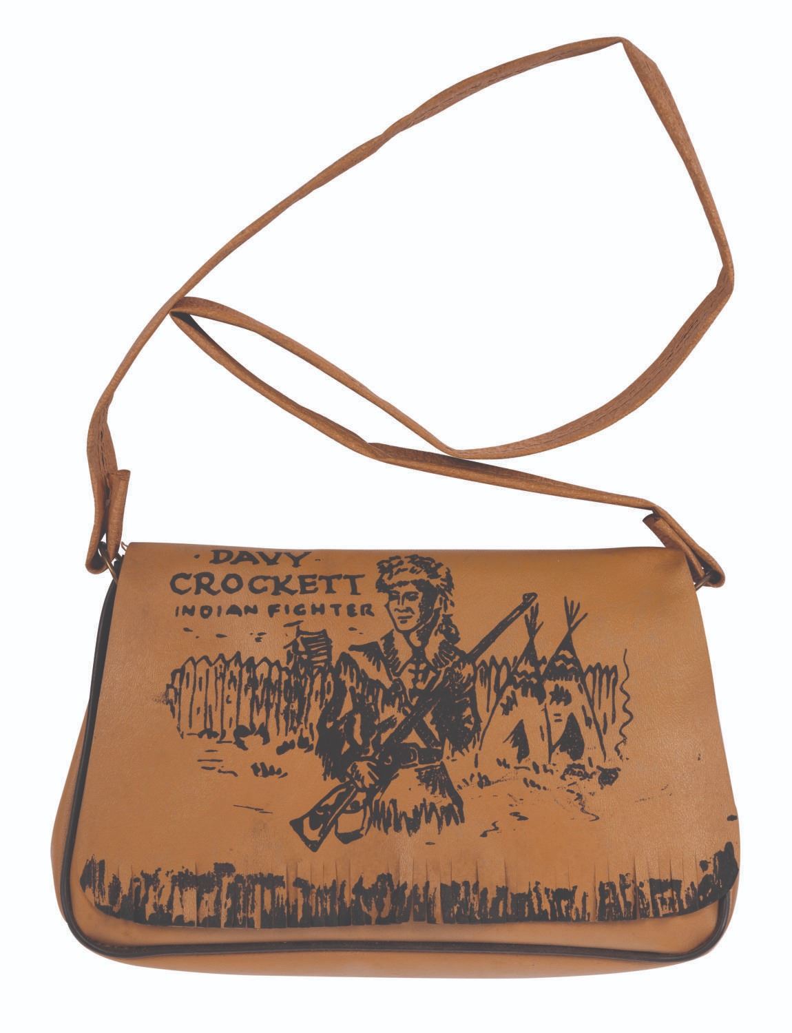 (1955) A Davy Crockett Indian Fighter bag. This 10.5" x 5.5" vinyl bag with shoulder strap is in very fine, unused condition. It was found stuffed with newspaper dated June 15, 1955, suggesting it was bought at the height of the Crockett Craze and carefully preserved since.