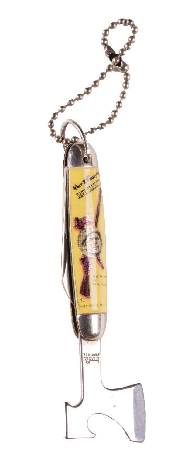 (Imperial, 1950s) A Davy Crockett Multi-Purpose Tool by Imperial. The tool features Fess Parker as Walt Disney's Davy Crockett and contains both a knife and hatchet head bottle opener. Measuring 3.5" long and 1" wide, the knife is in good condition overall with very good condition with faint scuffs and scratches to the hatchet head.