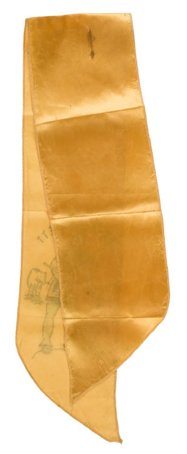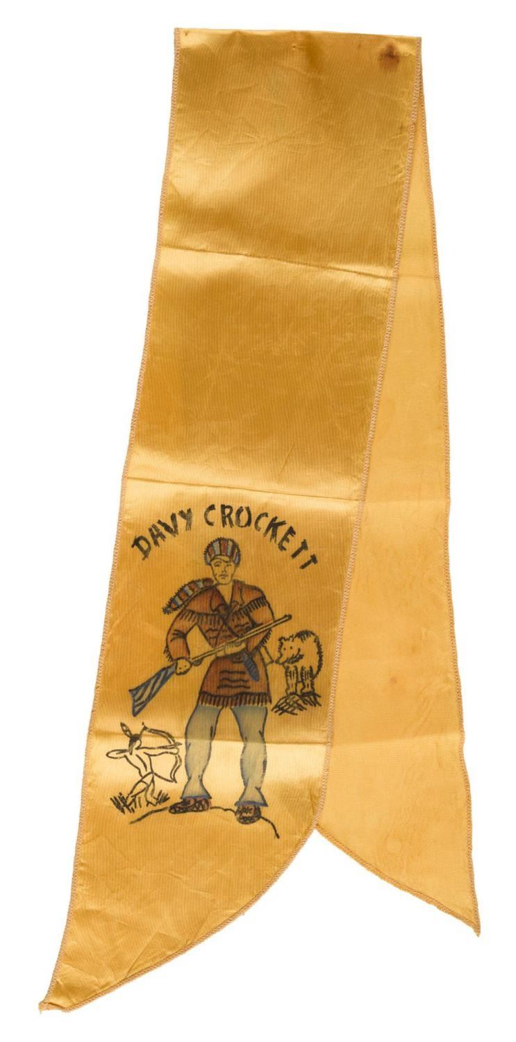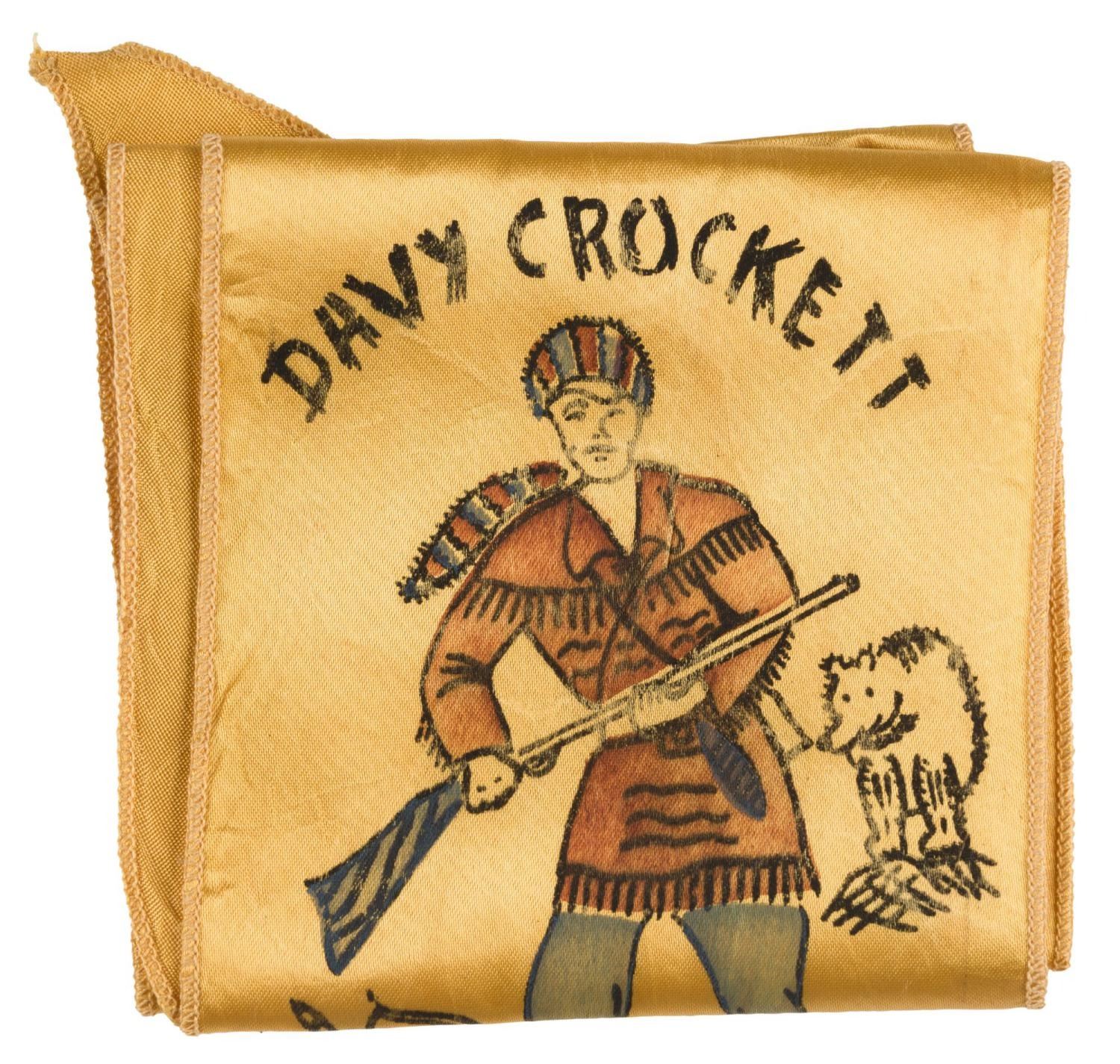 (1950s) A Davy Crockett neckerchief bandana sash by an unknown manufacturer. Measuring 38" long, the neckerchief displays in good condition with stains, creases, wear, and discoloration from age.