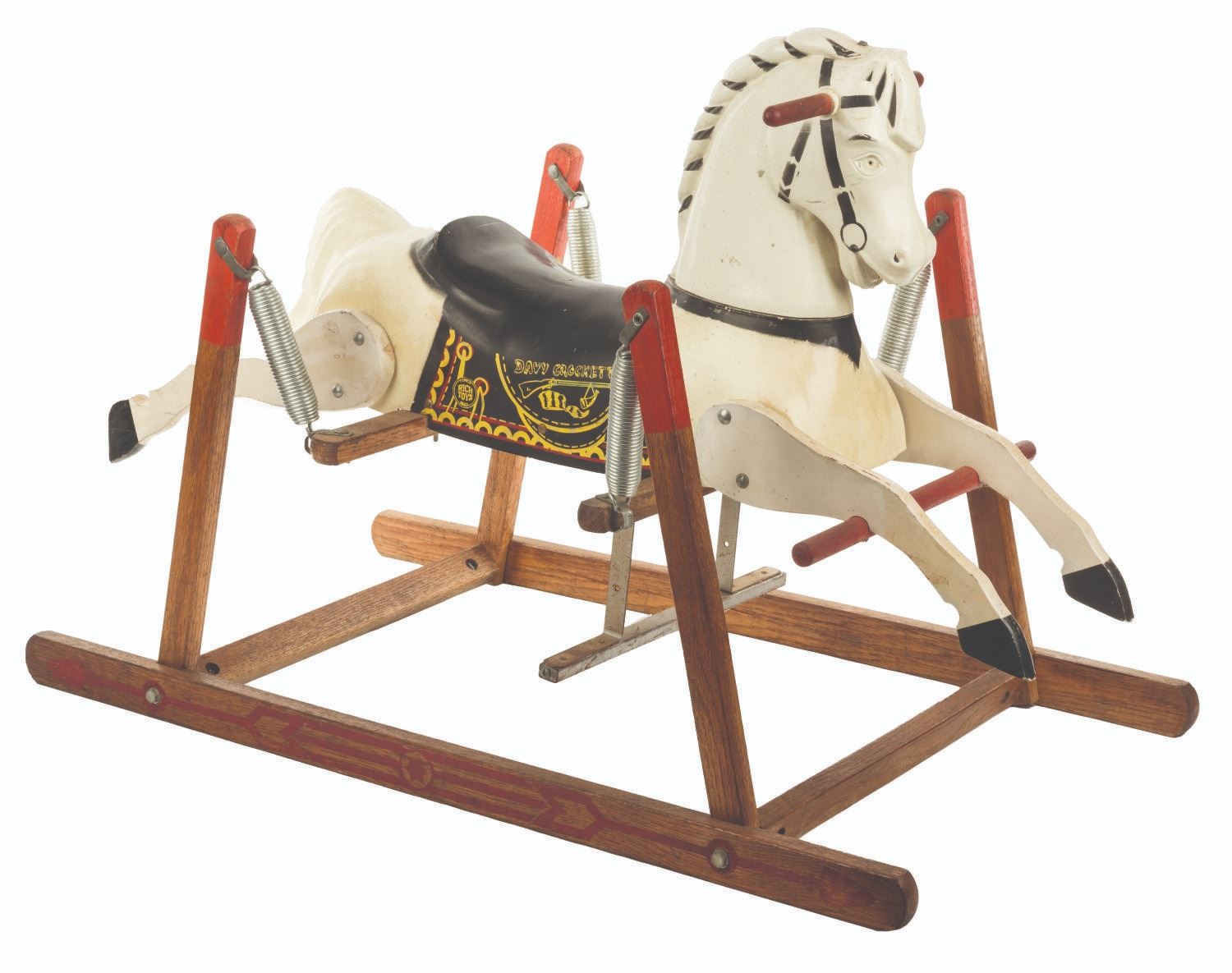 (Rich Toys, 1950s) A Davy Crockett Rocking Spring Horse by Rich Toys of Topsfield, Massachusetts. The horse features a plastic body, wooden legs and handle, and metallic springs and hardware. The bell is still functioning and audible. Measuring 18.75" x 34.25" x 23.75" tall, the toy is in good condition, despite loose assembly from use and age and dust, soiling, scuffs, and scratches to painted areas and wooden parts.