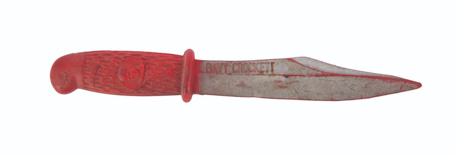 (1950s) A toy rubber knife with Davy Crockett's name and likeness on each side. Measuring 7" x 0.75", the toy is in good condition with wear from use.