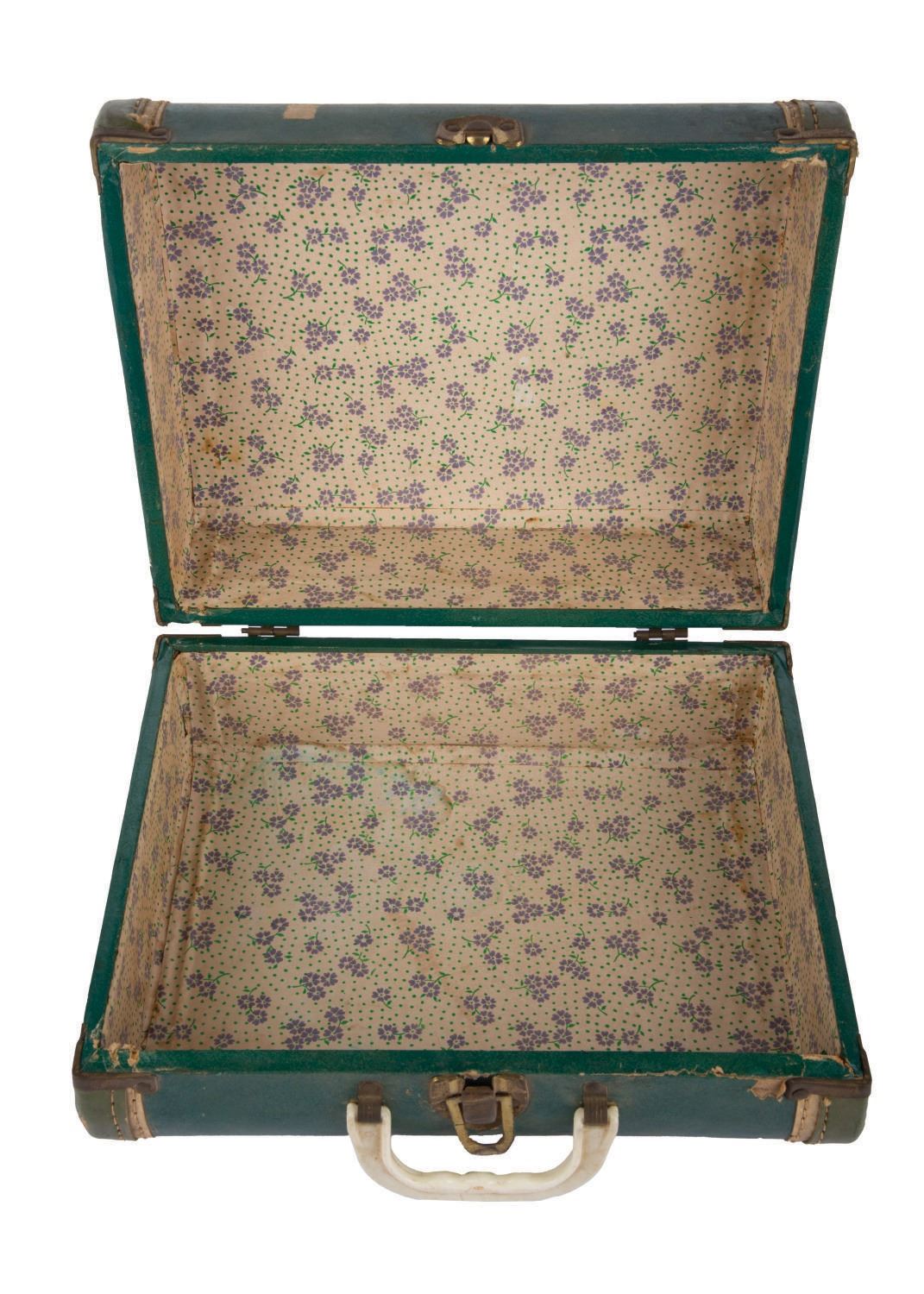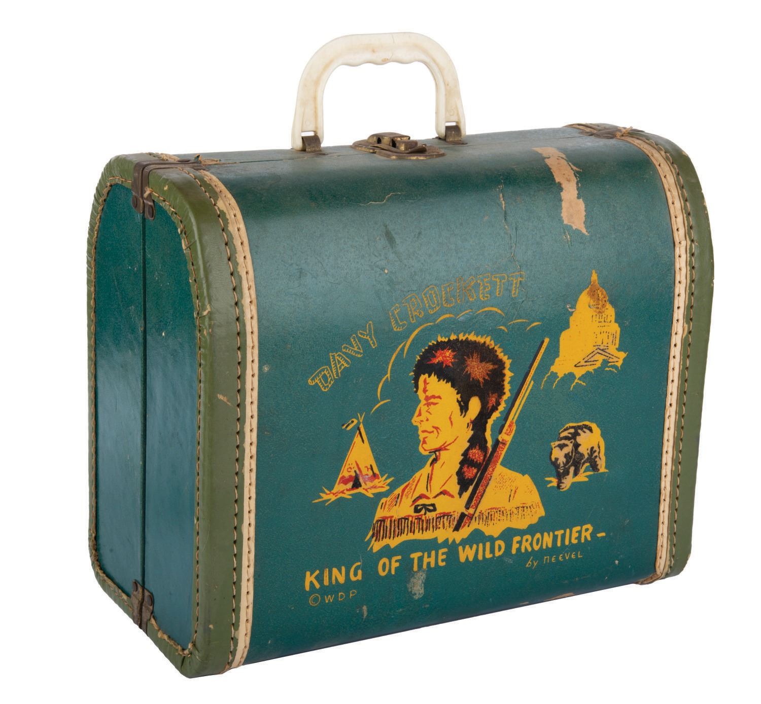 (Neevel, 1950s) A rare Disney's Davy Crockett suitcase. The green case is emblazoned with a deep yellow image of Crockett, with fuzzy-textured red and black accents. Measuring 12"x10"x6", the suitcase is in very good condition, with typical light wear, very slight staining to the interior, and one bare spot 2.5" long from an applied then removed piece of tape.