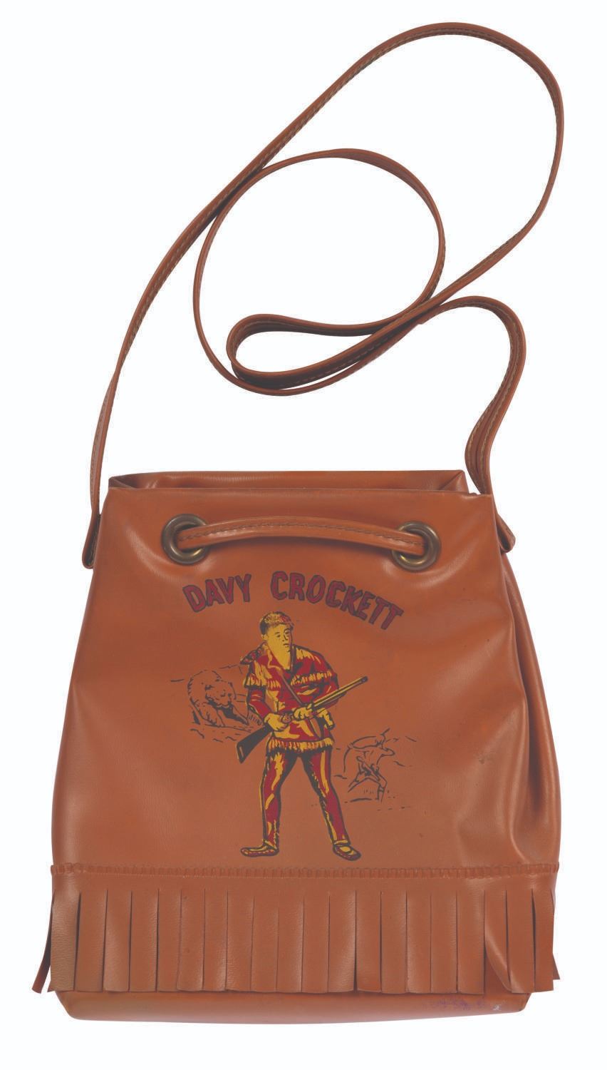 (1950s) A Davy Crockett vinyl satchel featuring an image with name of Davy Crockett, produced in the 1950s. Measuring 6" x 6" with vinyl strap, the purse is in fine unused condition.