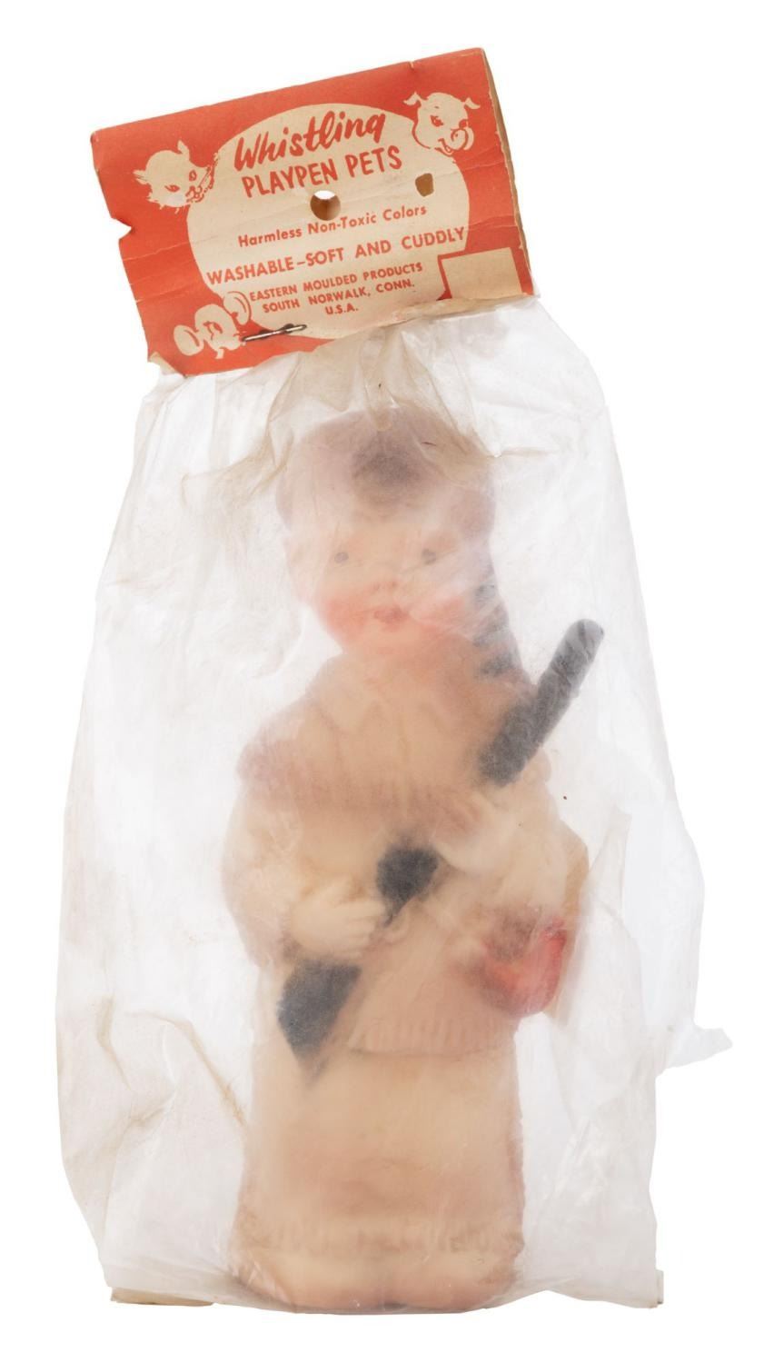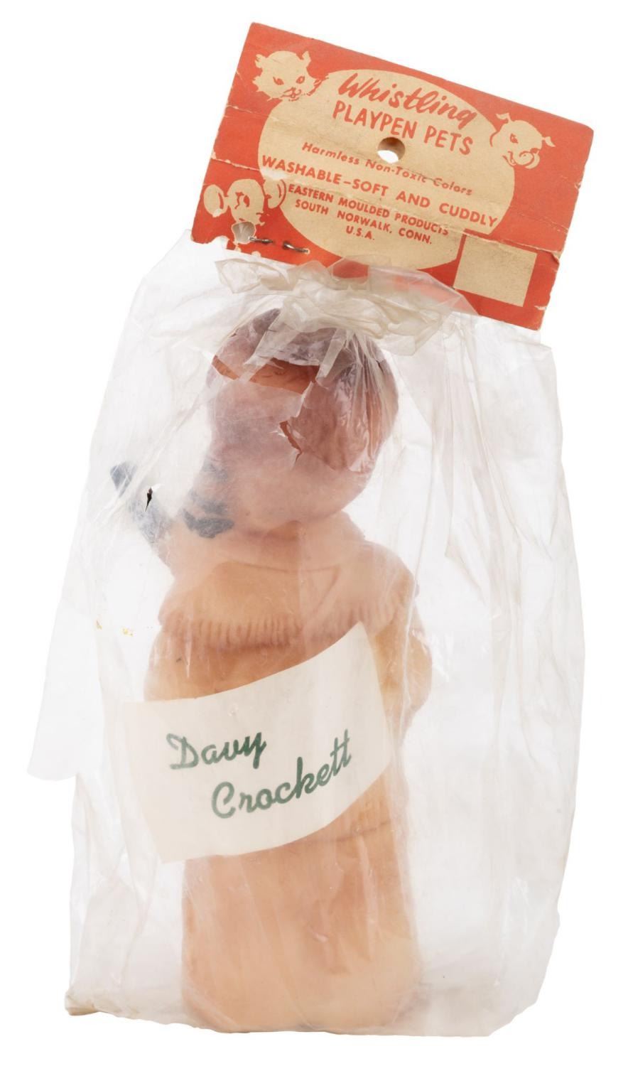 (Eastern, 1950s) A Davy Crockett Whistling Playpen Pet by Eastern Moulded Products. Measuring 6.5" tall, the toy comes in an original polymer bag with a card. The toy is in very good condition with slight tarnish to the metal base of the rubber toy and creases, folds, wear, and tears to the card and plastic bag.