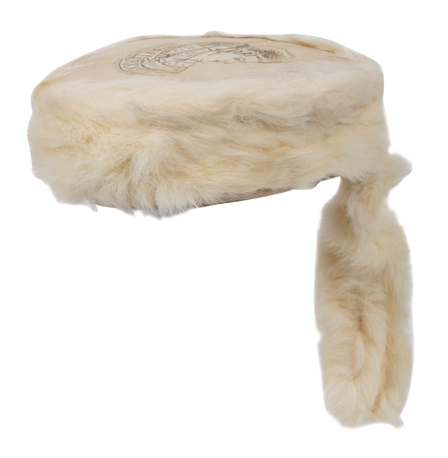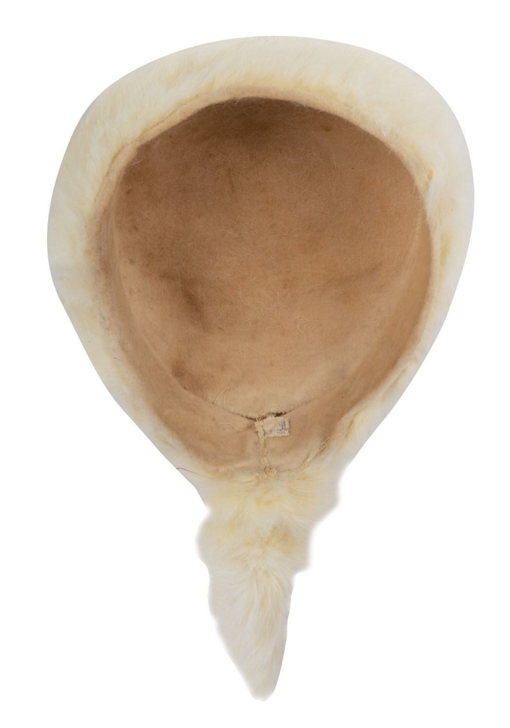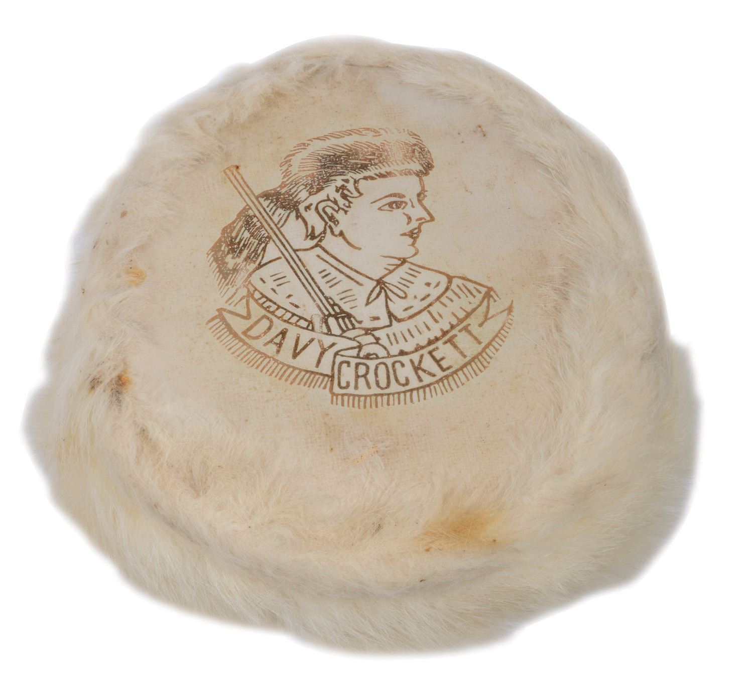 (1950s) A rare Davy Crockett white rabbit fur hat. Polly Crockett was the favored image for white fur hats at the time, with Davy Crockett scarcer. Measuring 7" diameter with 6" tail, this delicate piece is in very good condition, with some scuffing to the image and light spotting.