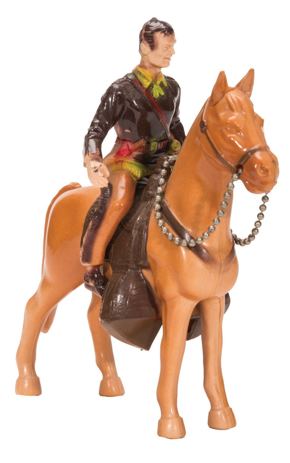 (Ideal, 1950s) A Davy Crockett and His Horse & Box by Ideal Toy Corporation. The set comes with plastic painted figures of Davy and Horse and comes with metal reigns, but no hat. The figure is 5.25" long and 5" tall while the box is 4.75"x5"x2.25", each in very good condition despite faint wear to painted areas of figures and mild dents, creases, and few tears to box.