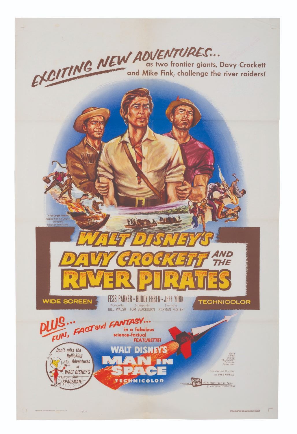 (Disney, 1956) An original one-sheet poster for the Fess Parker adventure film, “Davy Crockett and the River Pirates.” Also billed with the feature is the animation and live-action documentary “Man in Space,” directed by Ward Kimball. Measuring 27" x 41", the poster is in very good condition with light discoloration from age, a tiny separation at the upper center fold point, slight creases along the edges which do not affect the overall image, and the title stamp on the reverse slightly visible on the front.