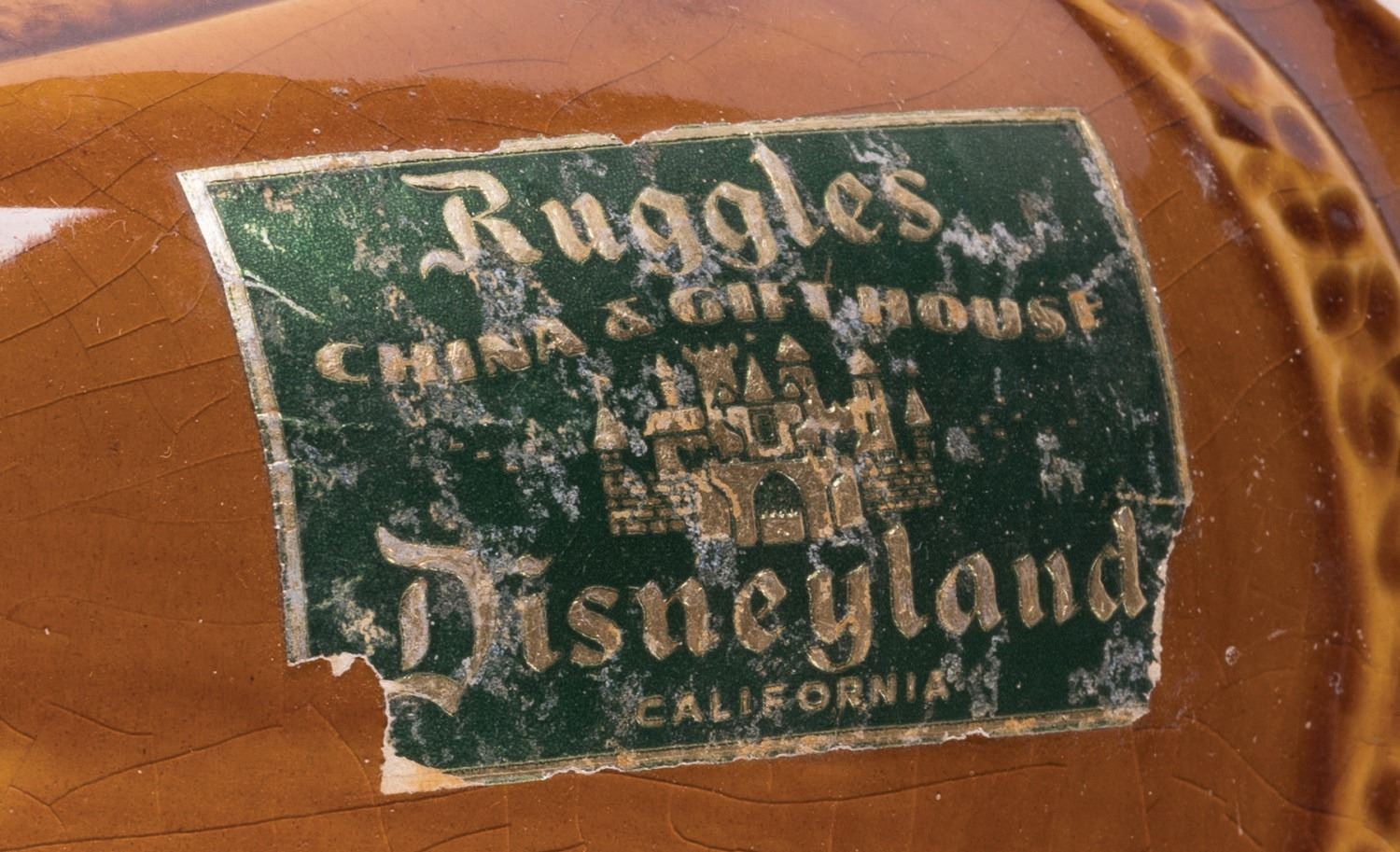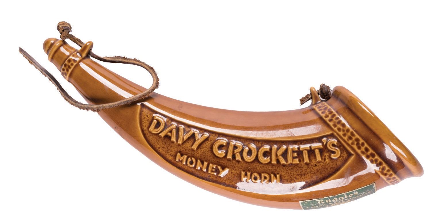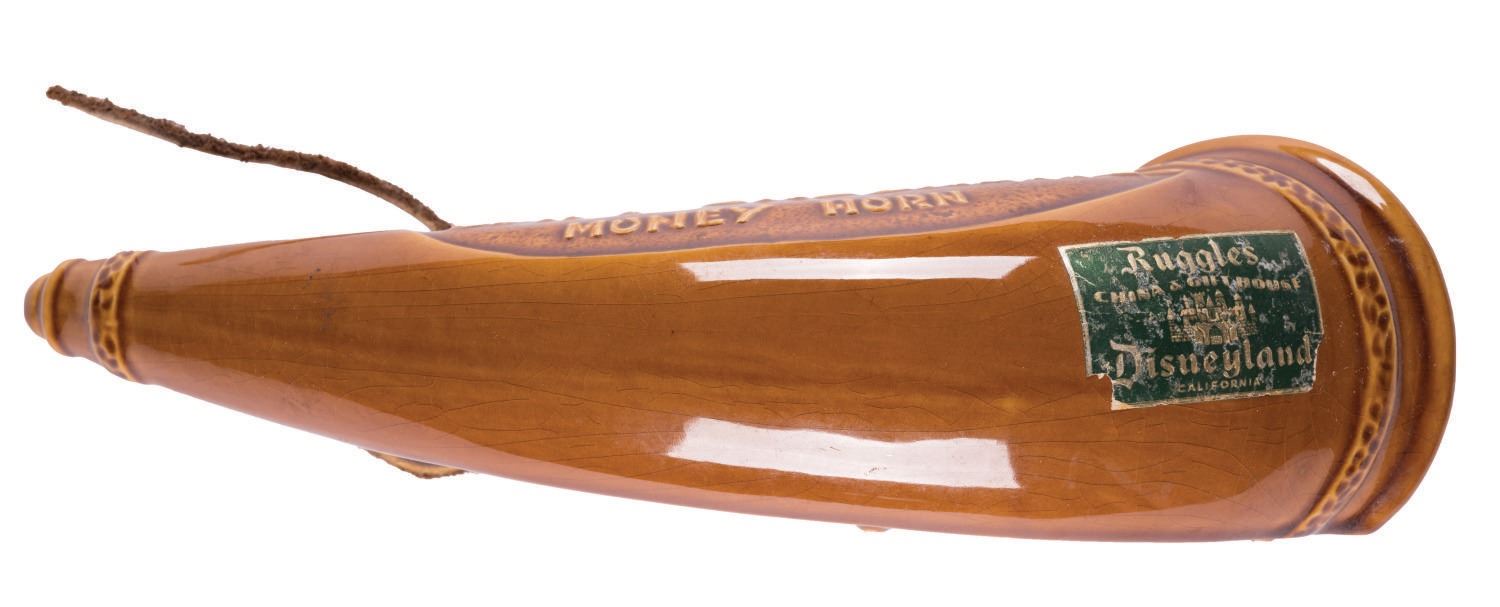 (Disneyland, 1955-64) A Davy Crockett's Money Horn Ceramic Bank. The ceramic bank was crafted, and hand painted by local manufacturer Marston Ceramic and retains a vintage label from Ruggles China & Gift House on Main Street. Measuring 12" long, the ceramic souvenir of Disneyland is in very good condition, with light wear and a brittle cork stopper, and broken leather cord from age and handling.