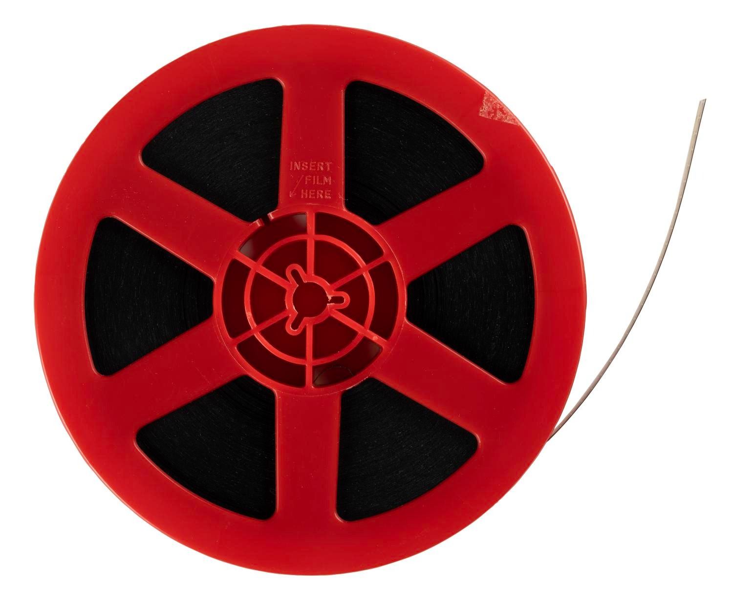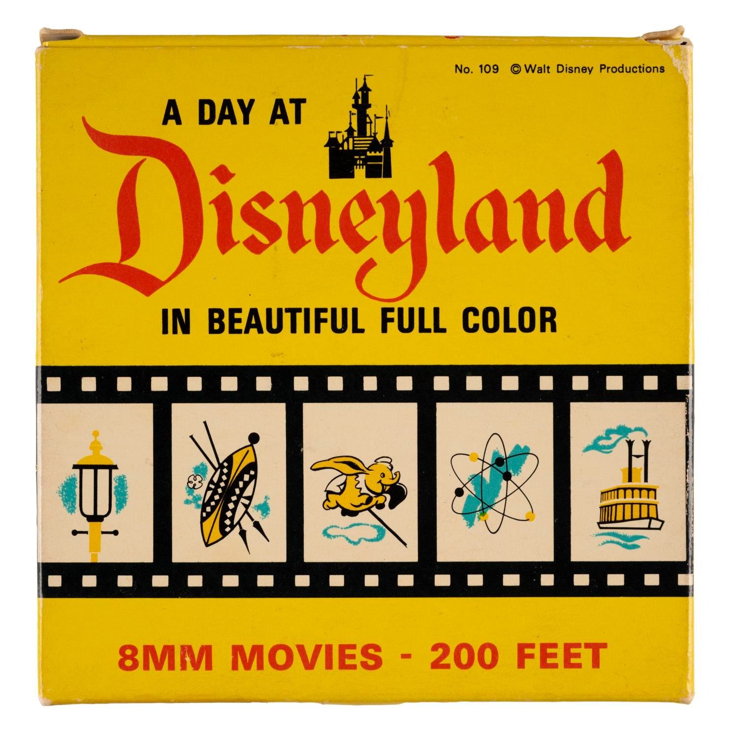 (Disneyland, 1960s) "A Day at Disneyland" Color 8mm Movie featuring scenes including the Flying Saucers, Indian Village, and Mickey Mouse greeting guests near the Mickey Mouse Club Headquarters. This 200-foot 8mm film reel comes within its original 5.25"x5.25"x.5" box and is in very good condition, exhibiting some minor scuffs and wear to its box.
