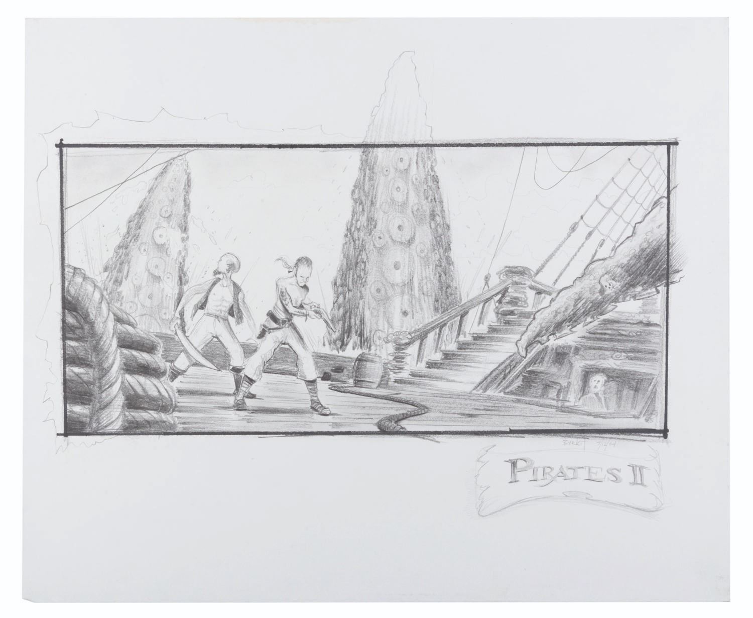 (Disney, 2004) A storyboard drawing from "Dead Man’s Chest” by the film’s storyboard artist James Byrkit. This drawing of the Kraken attacking the Black Pearl can be seen on page 104 of The Art of Pirates of the Caribbean book published by Disney Editions. Accomplished in graphite and measuring 14” x 17”, the drawing is in fine condition.