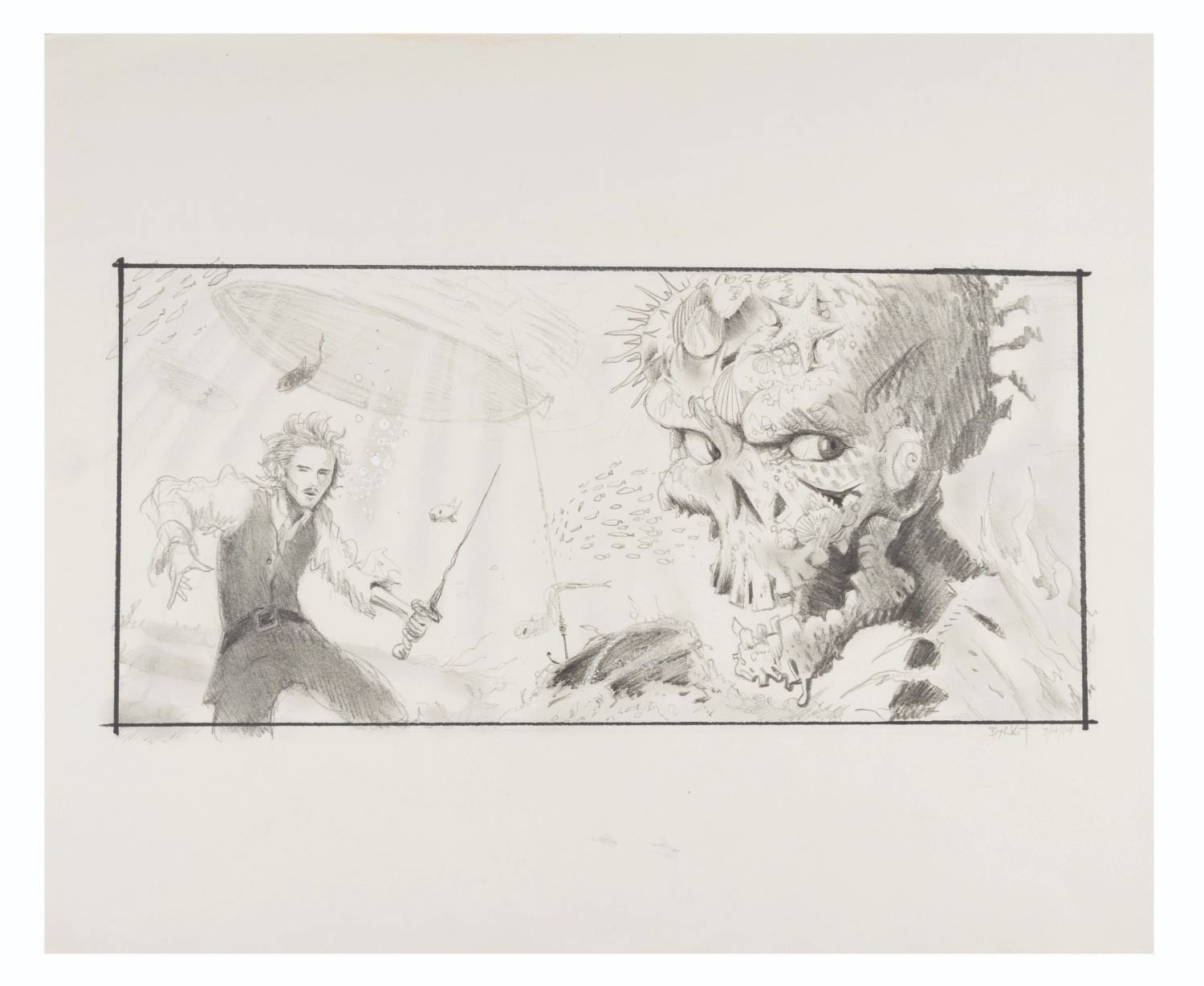 (Disney, 2004) A “Pirates of the Caribbean: Dead Man’s Chest” concept drawing by James Byrkit of Will Turner facing off with a skeletal member of Davy Jones’ cursed crew. With an image size of 7” x 14.5” on a 14” x 17” piece of drawing paper, the graphite drawing is in very good condition with light creases, discoloration at the top, and stray graphite smudges near the bottom.