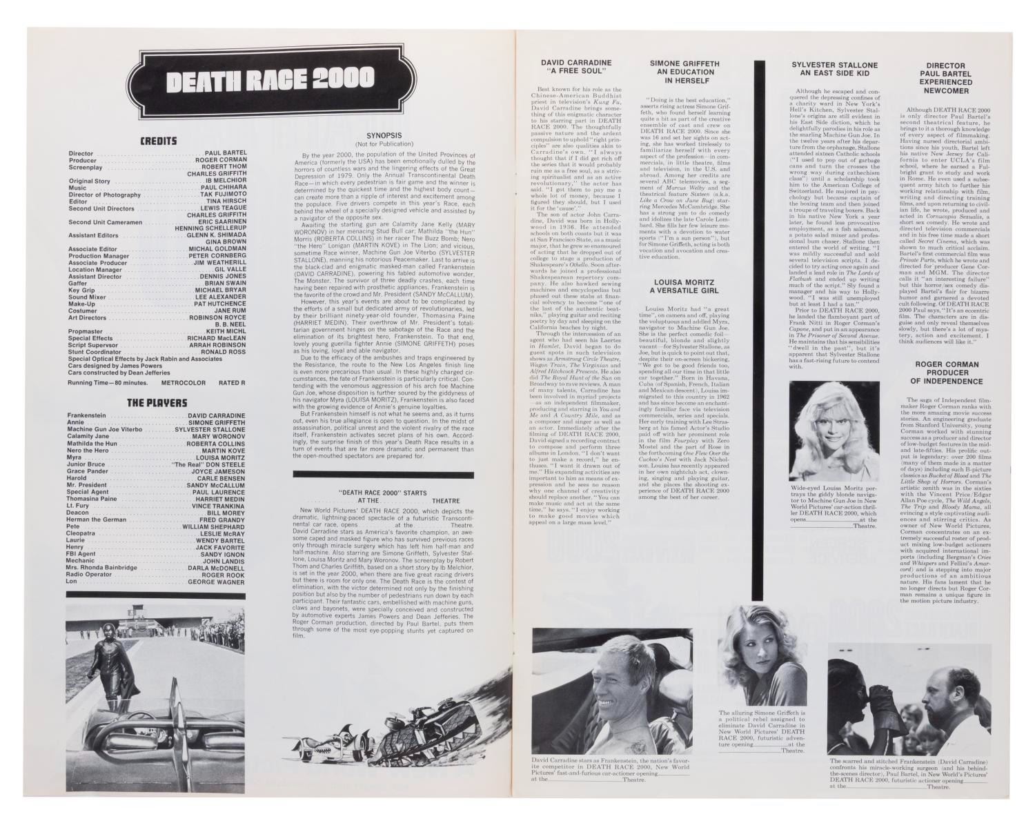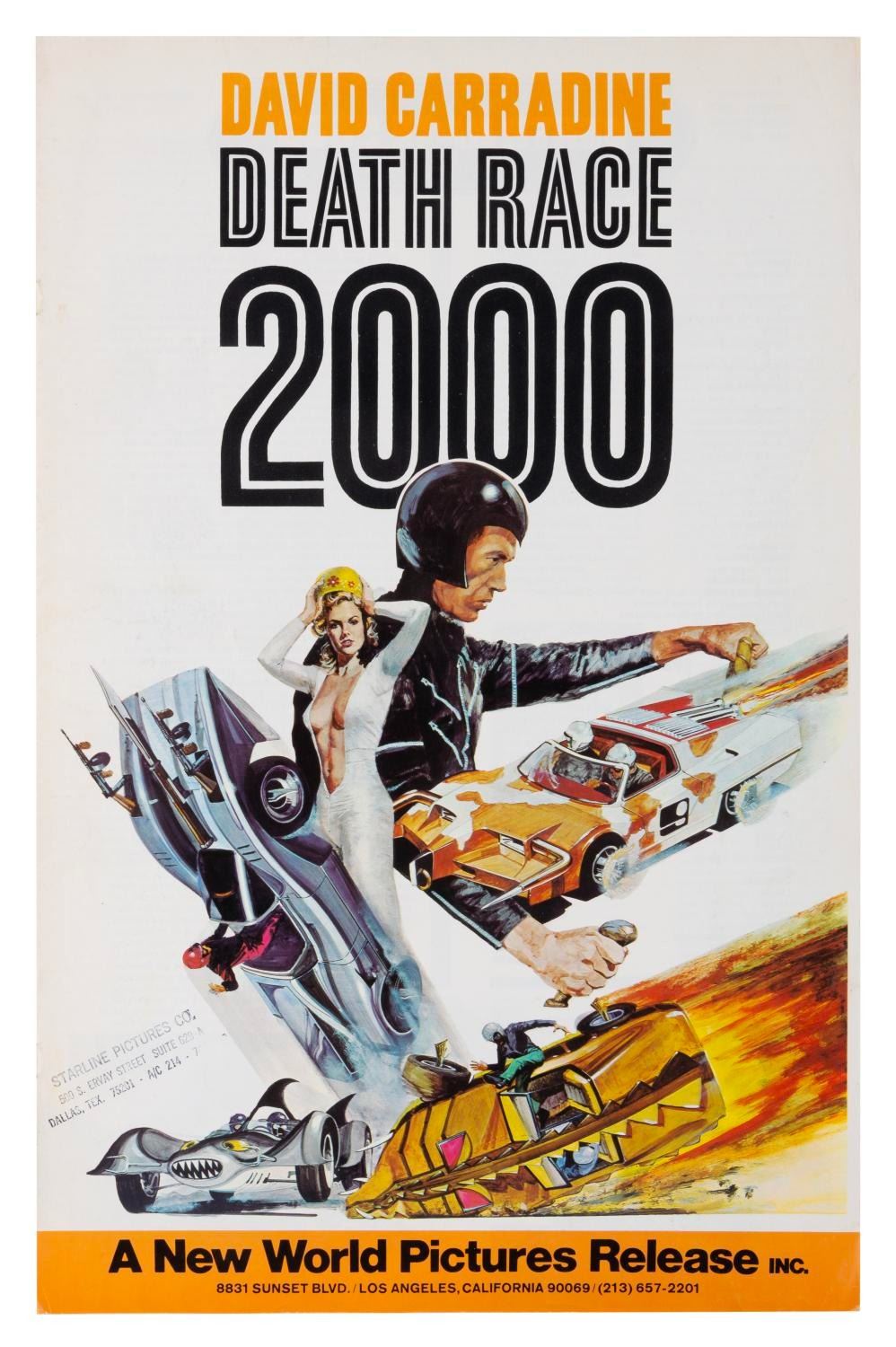 (New World Pictures, 1975) A pressbook for the cult sci-fi thriller "Death Race 2000" produced by Roger Corman. The twelve-page book includes publicity stories and layouts of all sizes for theaters to publish local ads. Measuring 11" x 16.75", the eight-page pressbook is in very good condition with typical light handling wear.