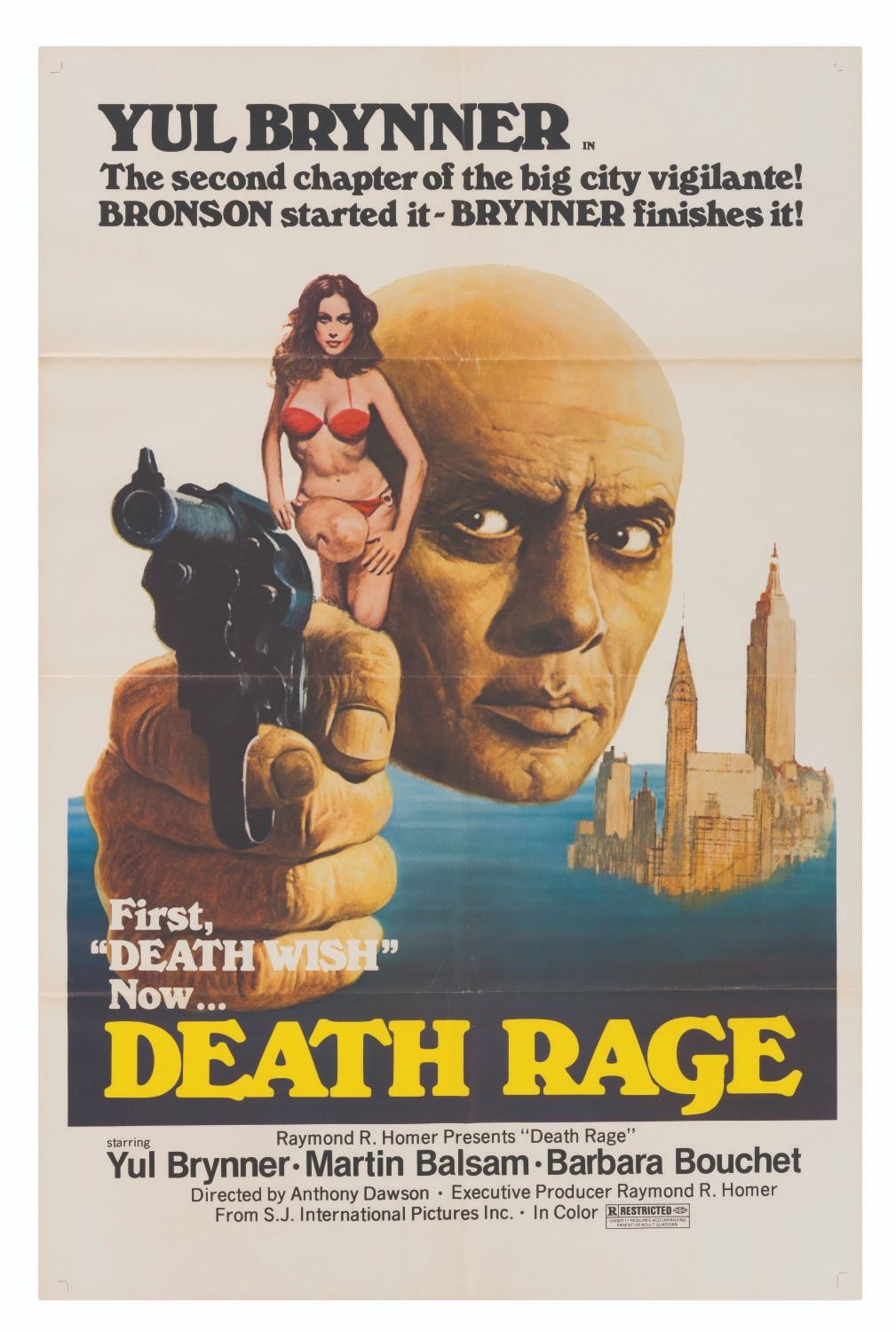 (Variety Distribution, 1976) A One-Sheet poster for Death Rage starring Yul Brynner. Measuring 27"x41", the poster is in very good condition, with original folds, and light discoloration to edges from age.