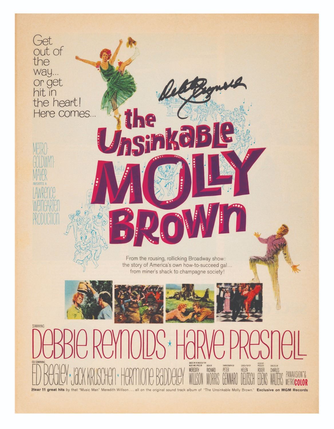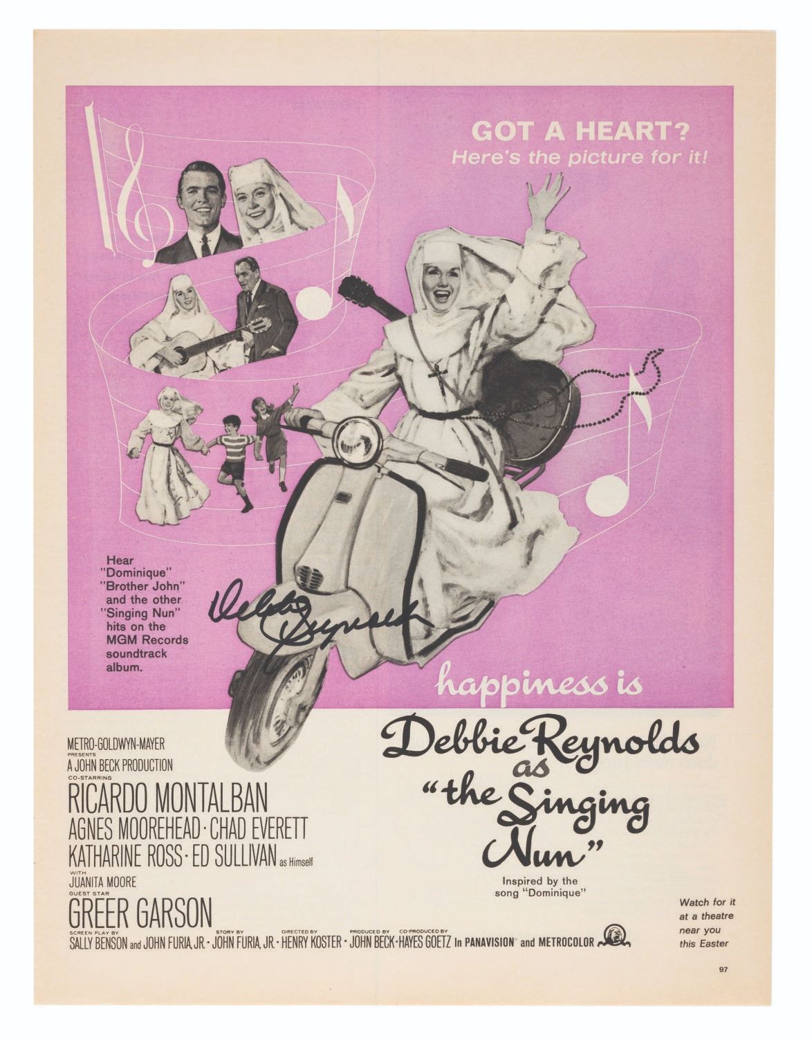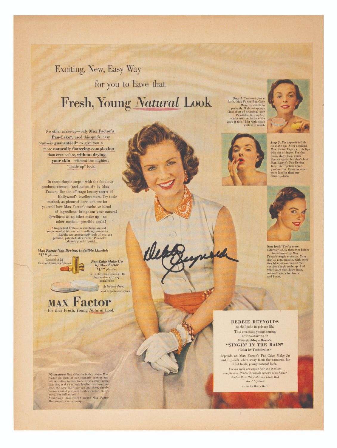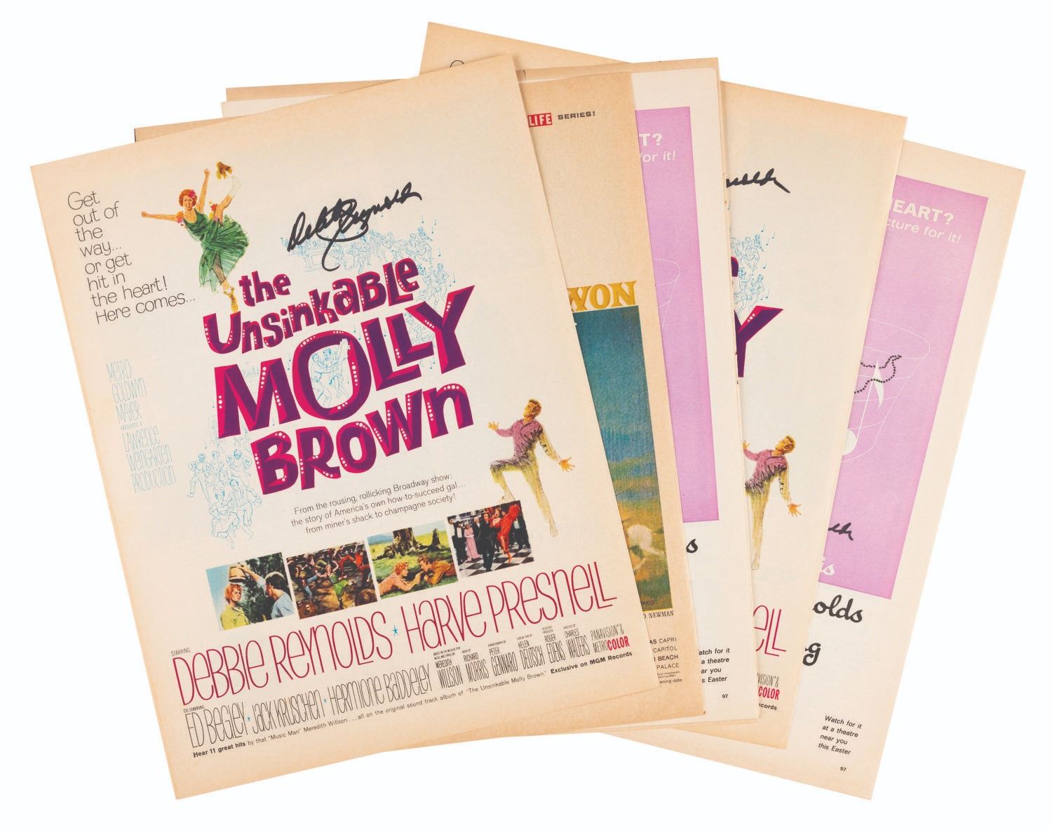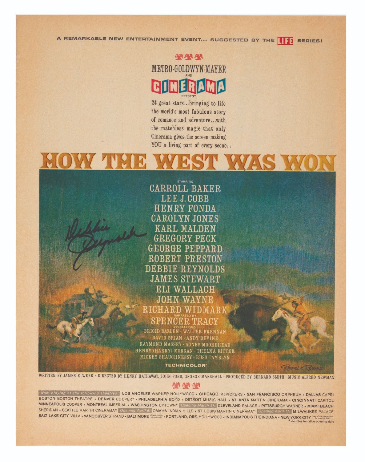 (Debbie Reynolds, 1980s-90s) A collection of eight full-page magazine advertisements signed by actress and singer Debbie Reynolds. Included are advertisements for “The Unsinkable Molly Brown,” “How The West Was Won,” “The Singing Nun,” and Max Factor cosmetics. The pages measure 13.75” x 10.5” and are in very good condition overall with light discoloration from aging.