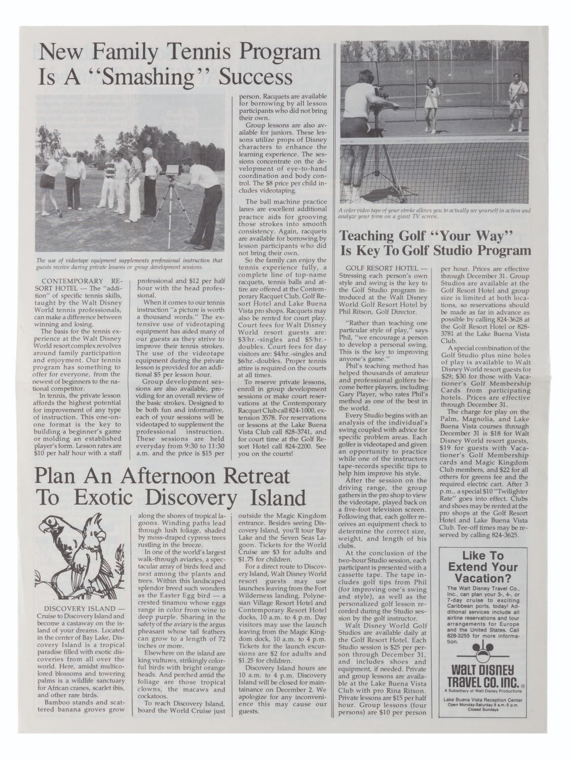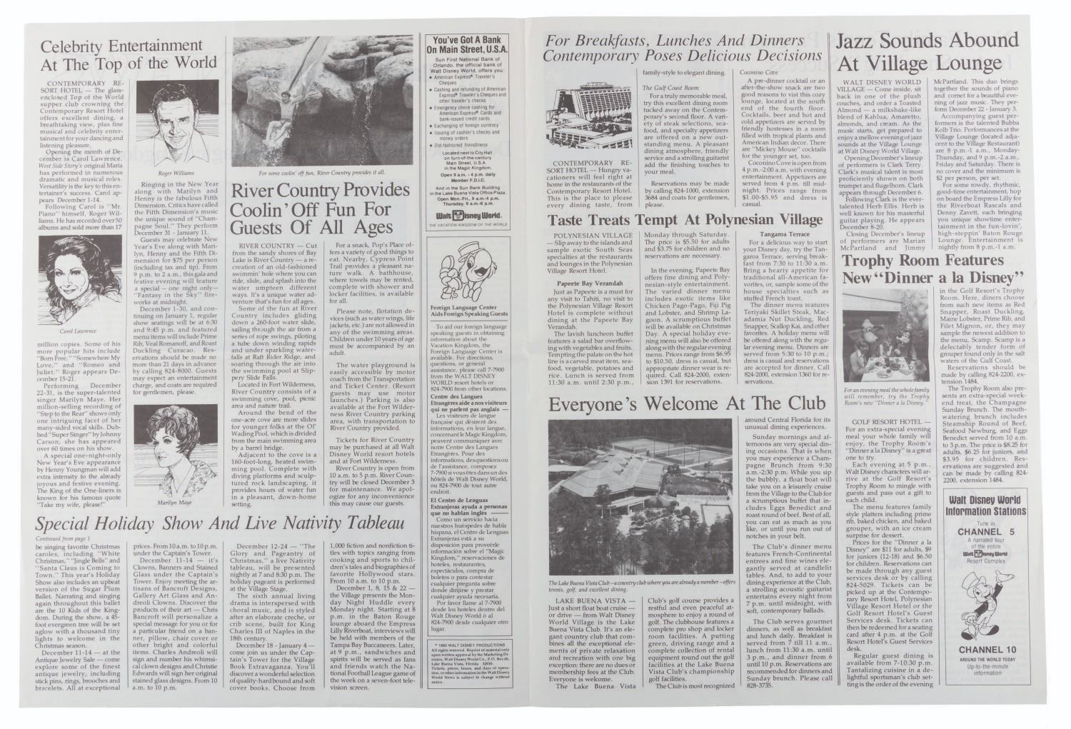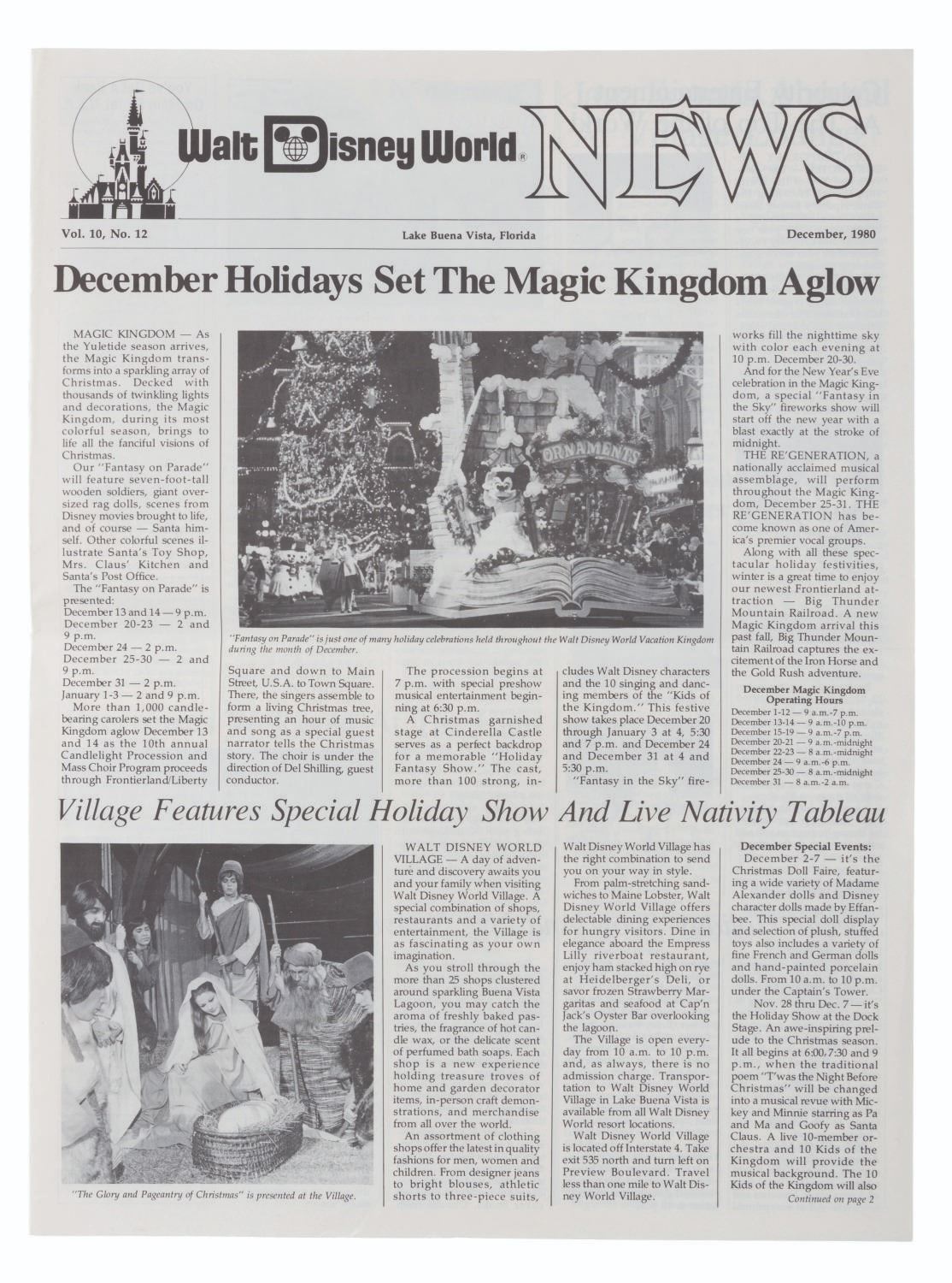 (Walt Disney World, 1980) The December 1980 Vol 10. No. 12 issue of Walt Disney World News. This edition of the periodical highlights the Park’s Holiday festivities, a new and successful family tennis program, an article on Discovery Island, and more. Measuring 11" x 15" open, the periodical is in very good condition with very light edge wear.