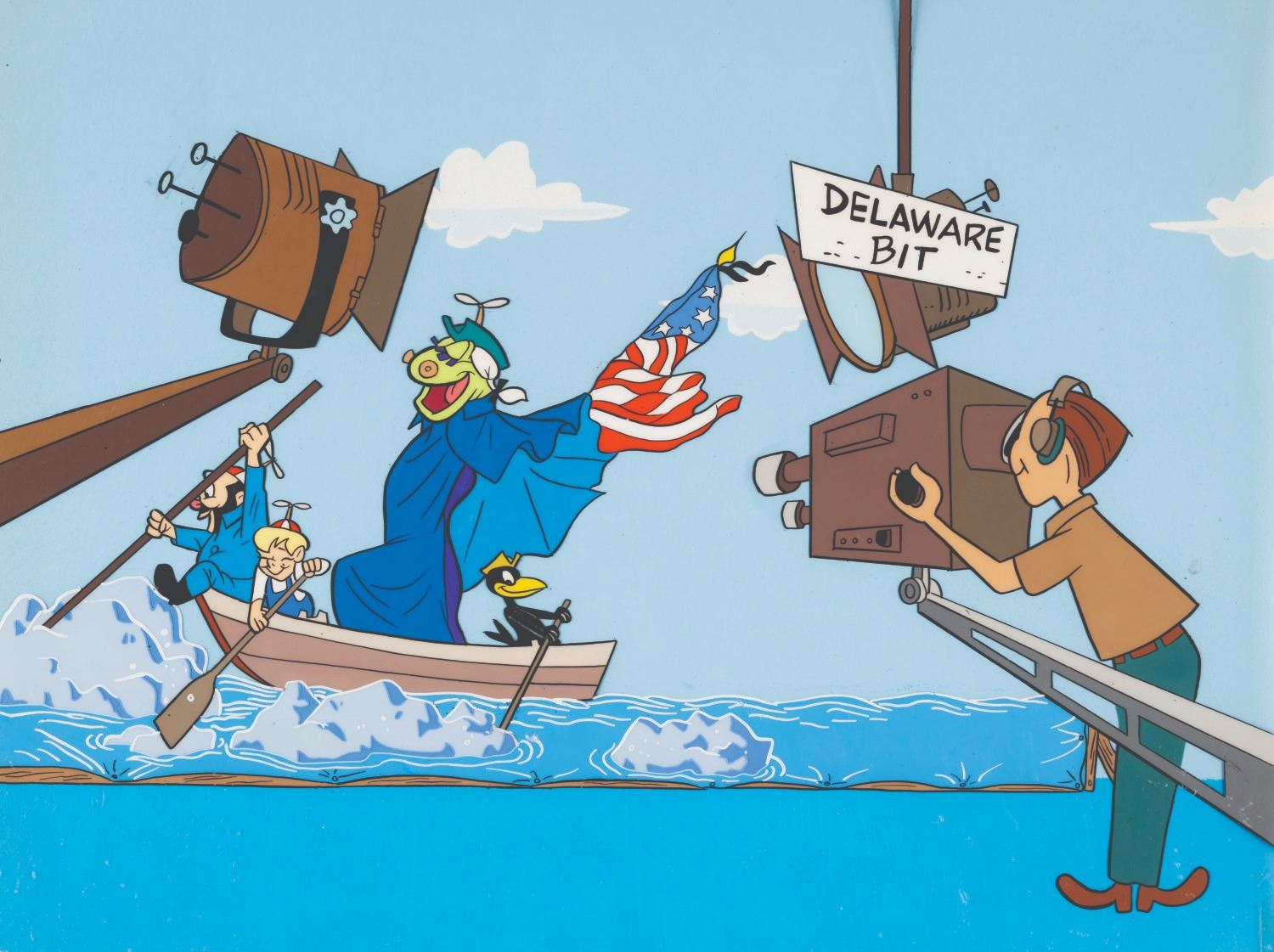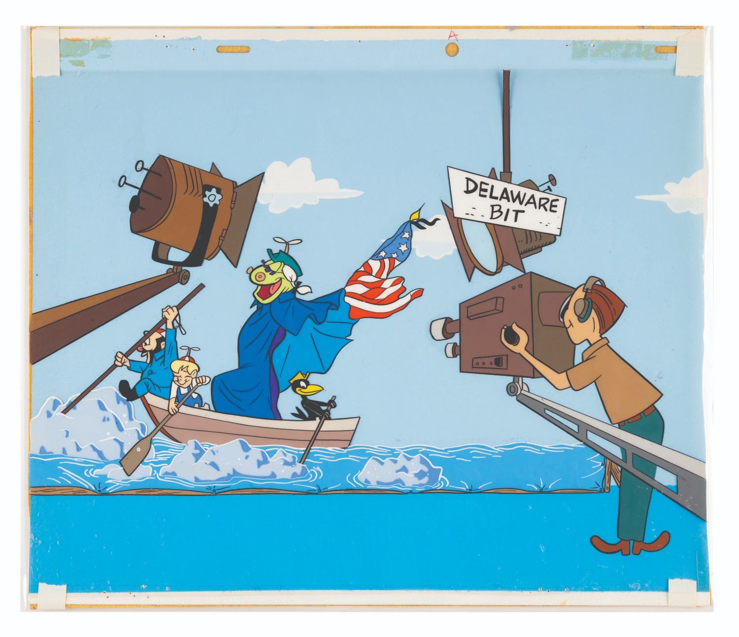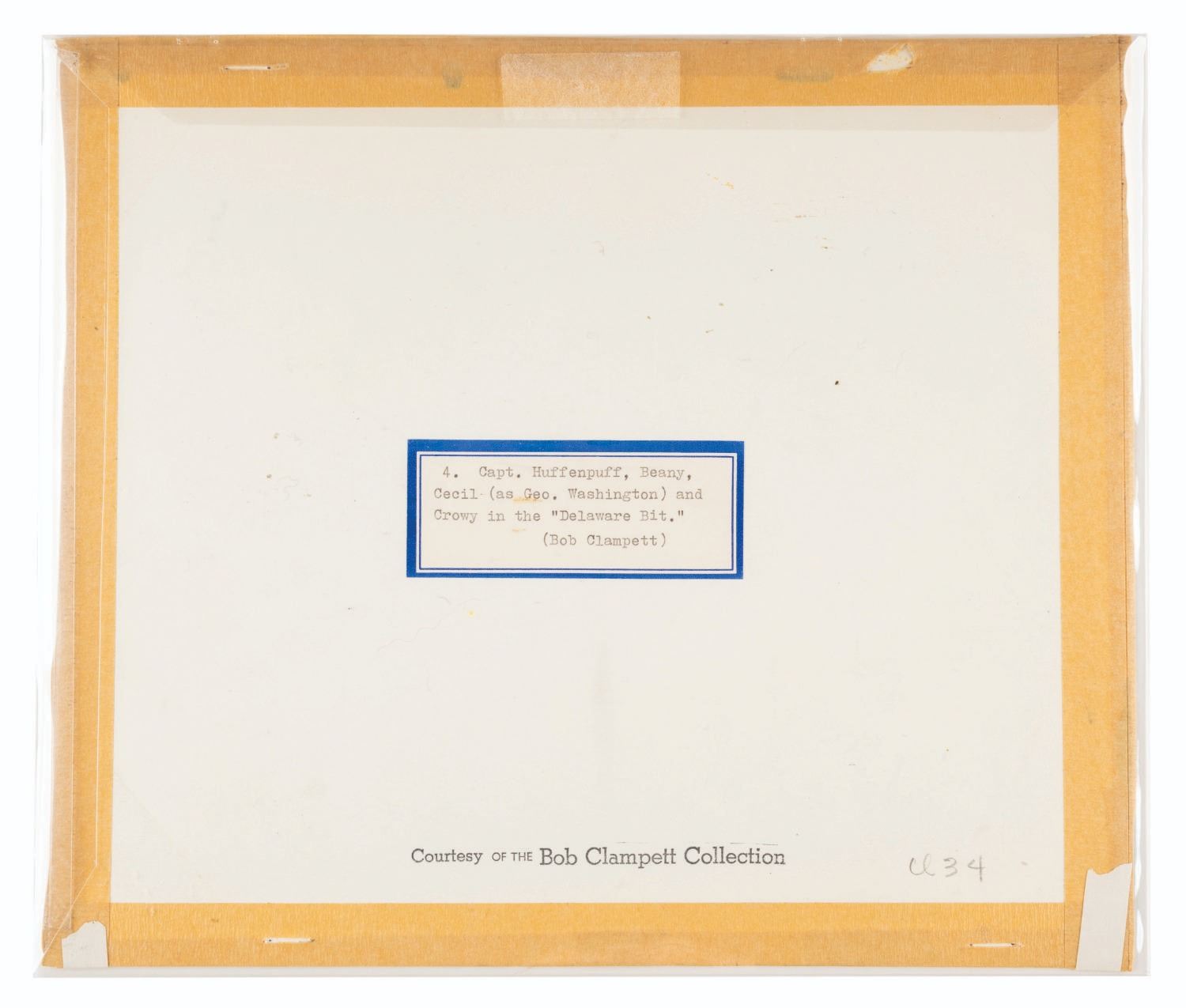 (Clampett, 1960s) A hand-painted cel and background of Capt. Huffenpuff, Beany, Crowy, and Cecil as George Washington filming the “Delaware Bit.” The 9.5” x 12.25” cel is in fine condition, taped at the corners to the 10.75” 12.25 background, which is in good condition with light edge wear, pinholes, and tape residue along the top edge.