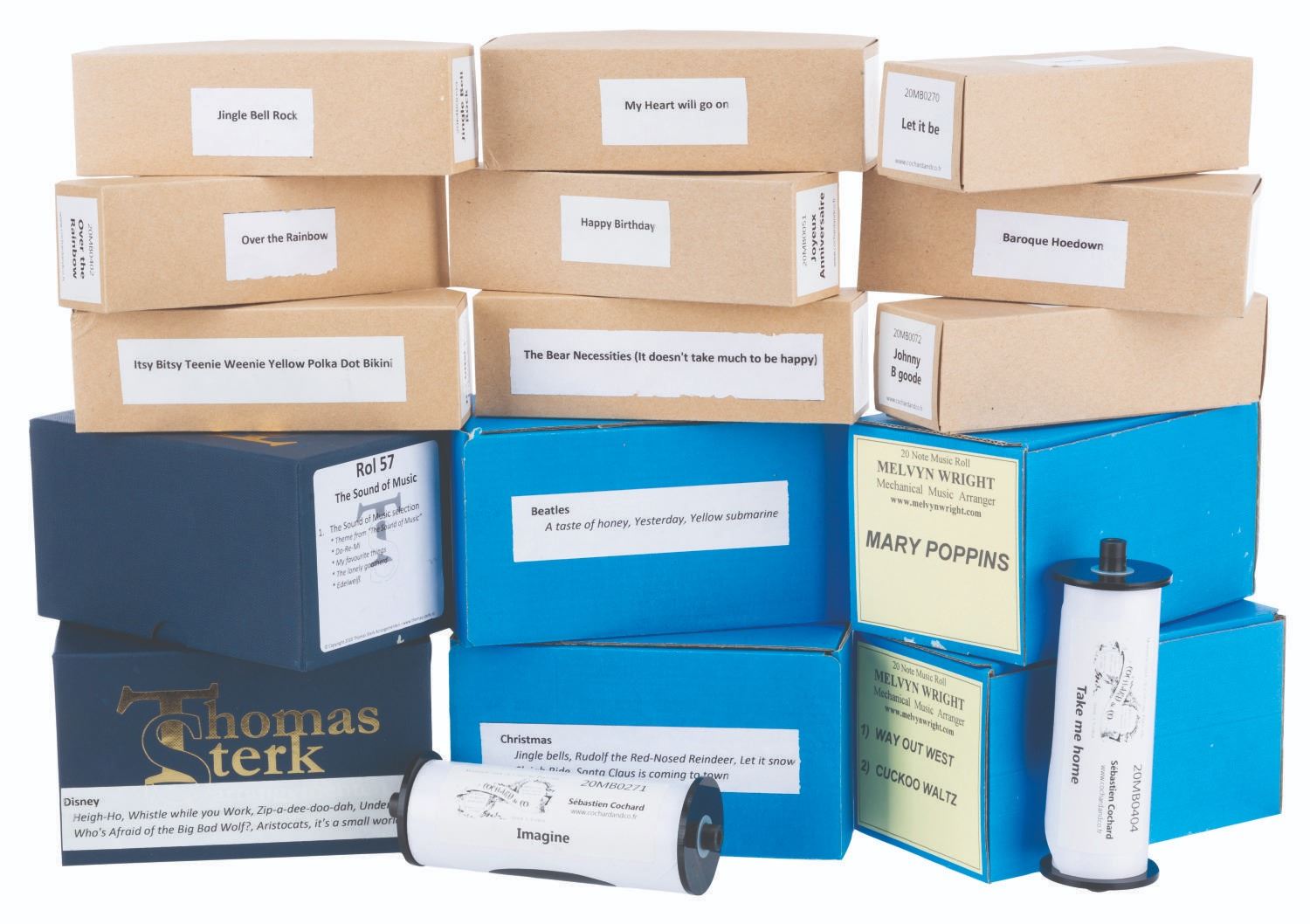 (Deleika, 1990s-2000s) A Deleika Dinkelsbuhl hand-cranked street organ and 17 music scrolls. Street organs were popular in Europe during the 1800s, operated by organ grinders who were sometimes accompanied by a monkey for added entertainment. This 20-key musical organ has 31 wooden pipes and a birch cabinet. The music scrolls include popular songs from "The Sound of Music," "Mary Poppins," "Titanic," classic Disney movies, the Beatles, and Christmas standards. The hand-cranked organ worked when tested, generating a rich, warm sound. Measuring 19.25” x 15.5” x 23” tall, the organ is in very good condition with light scratches, scuffs, and wear. Due to size and weight, special shipping arrangements are required. Please inquire before bidding.