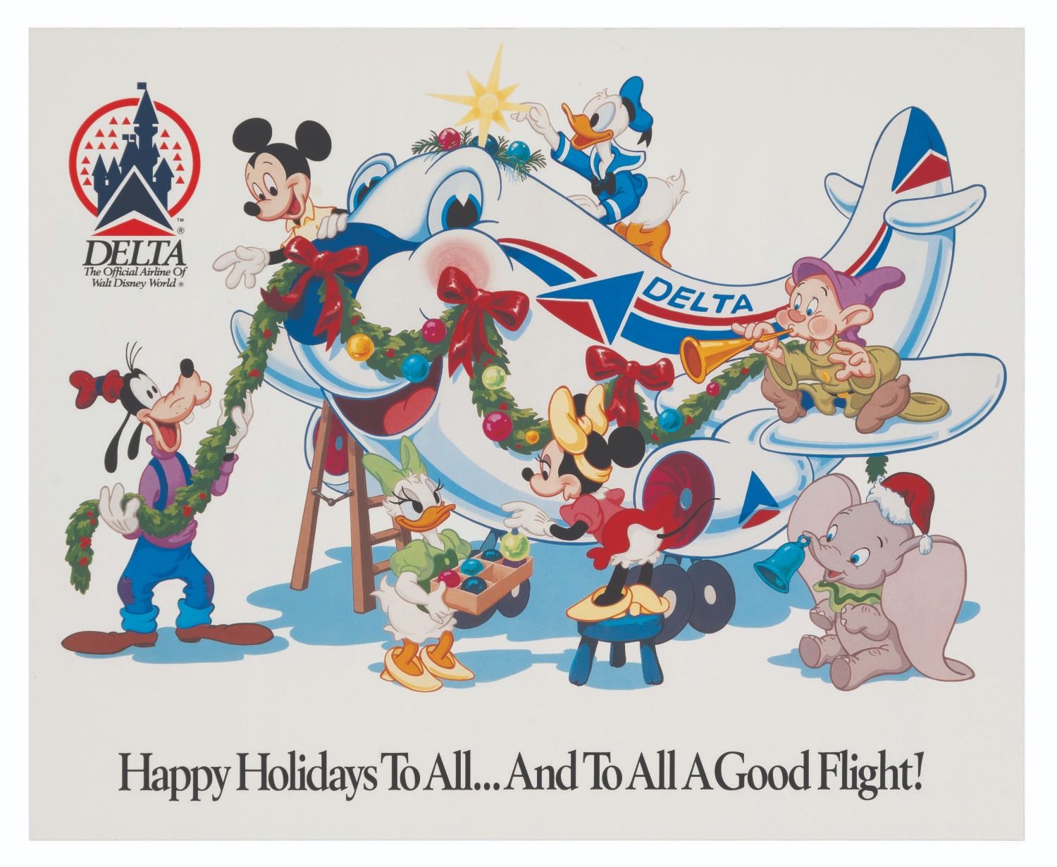 (Walt Disney World, 1980s) A holiday poster for Delta, the official airline of Walt Disney World, featuring Mickey Mouse and his friends. Measuring 18” x 22”, the poster is in good condition with creases, a light fold, and light water damage.