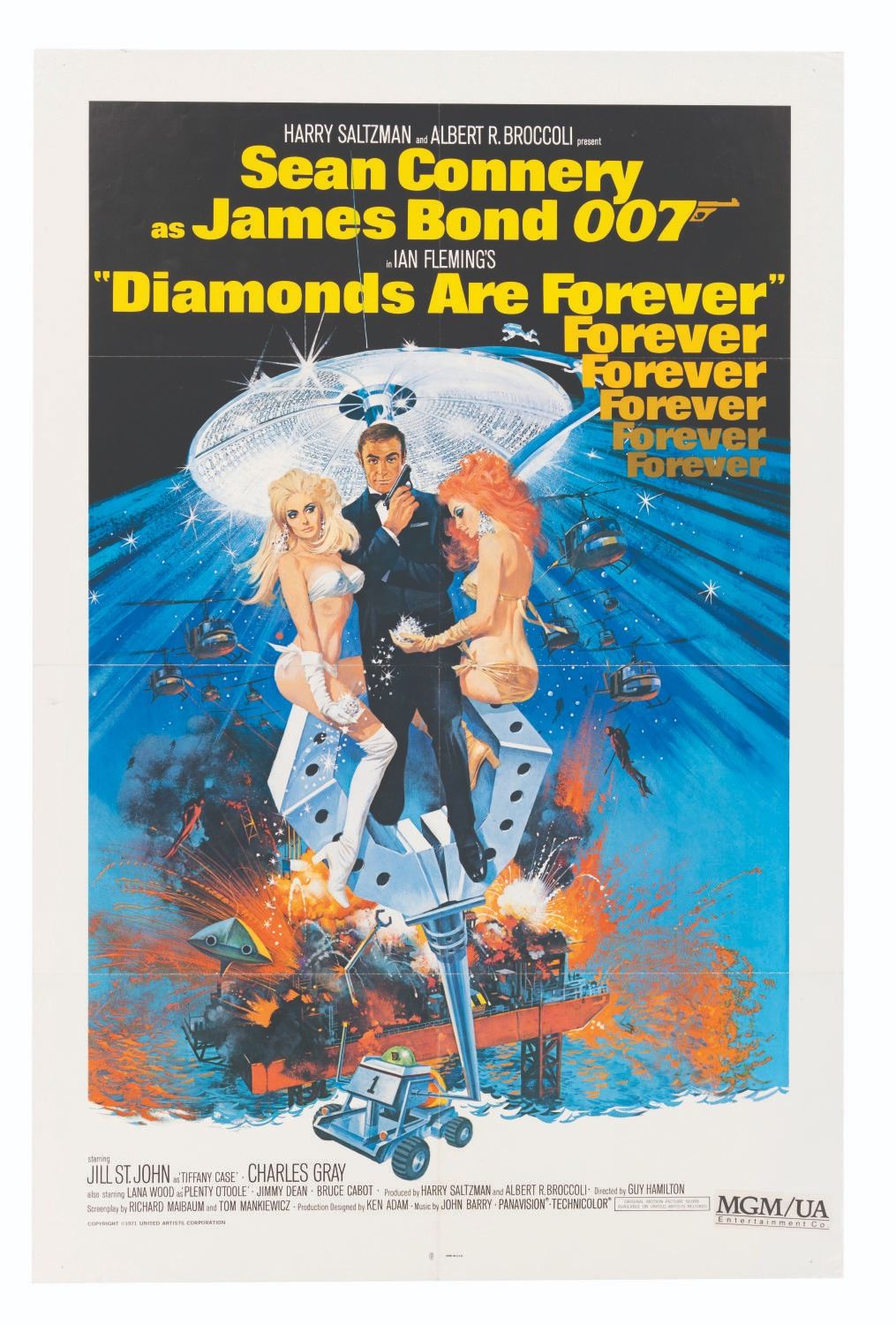 (United Artists, 1971) An original one-sheet poster for"Diamonds are Forever", the seventh installment of Ian Fleming's James Bond 007 franchise. This poster includes a"MGM/UA" sticker over the original"United Artists" billing in the bottom right corner, reflecting it was in theatrical circulation after the companies merged in 1981. Measuring 27"x41", the poster is in very good condition, with typical wear along the original folds slightly touched up at center, and light wear overall.