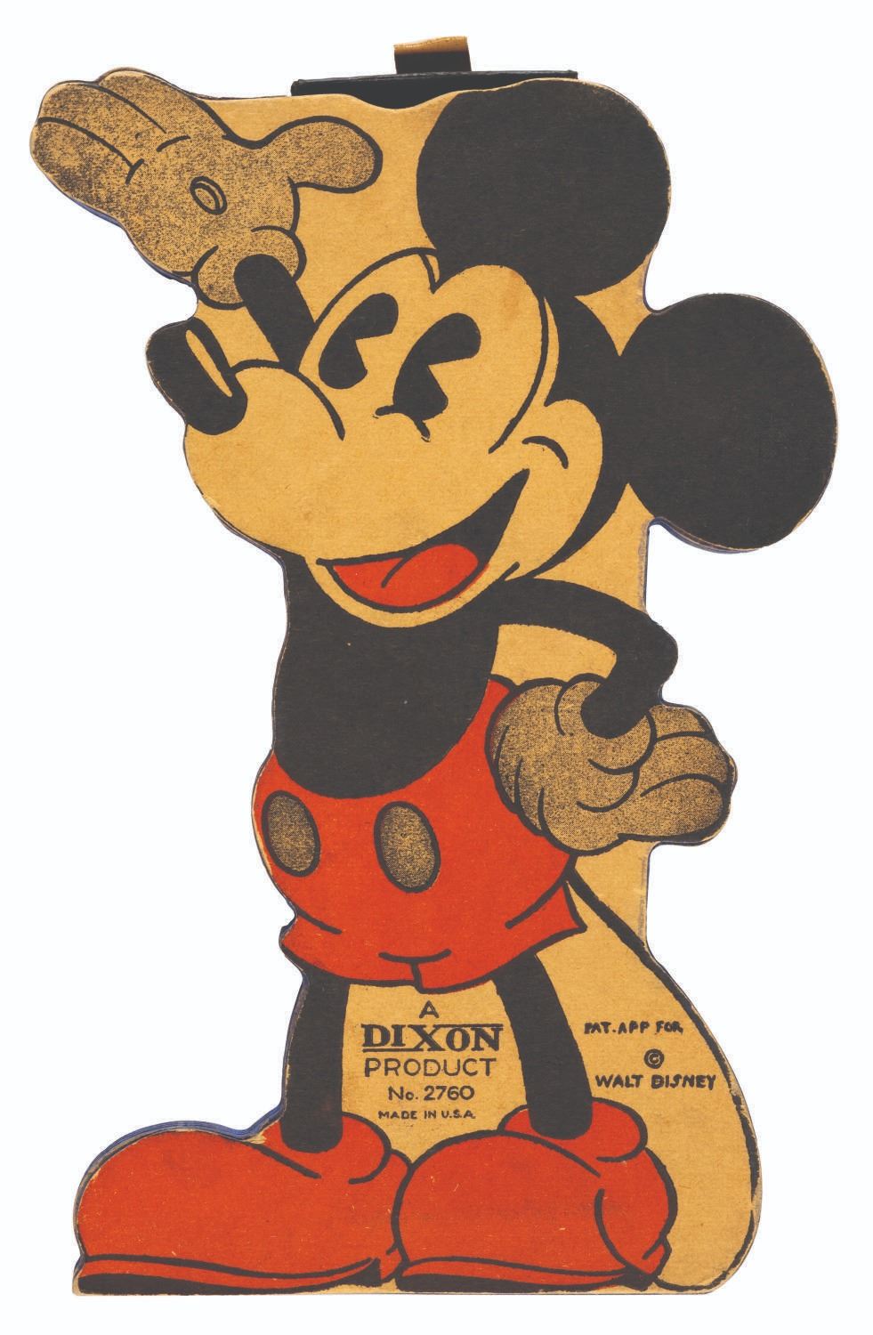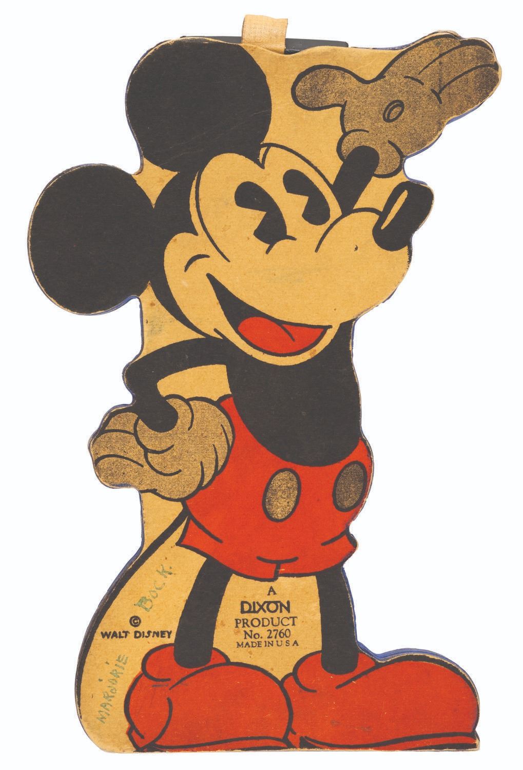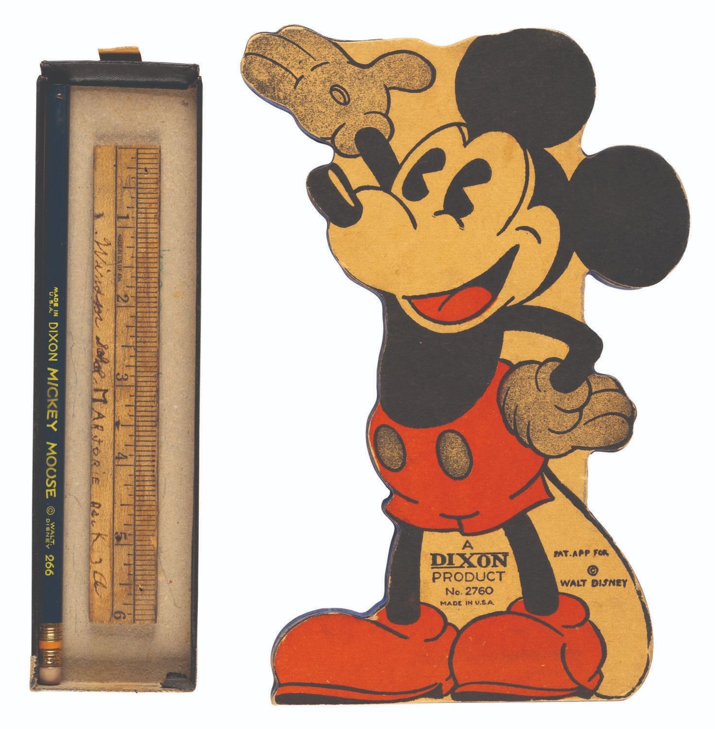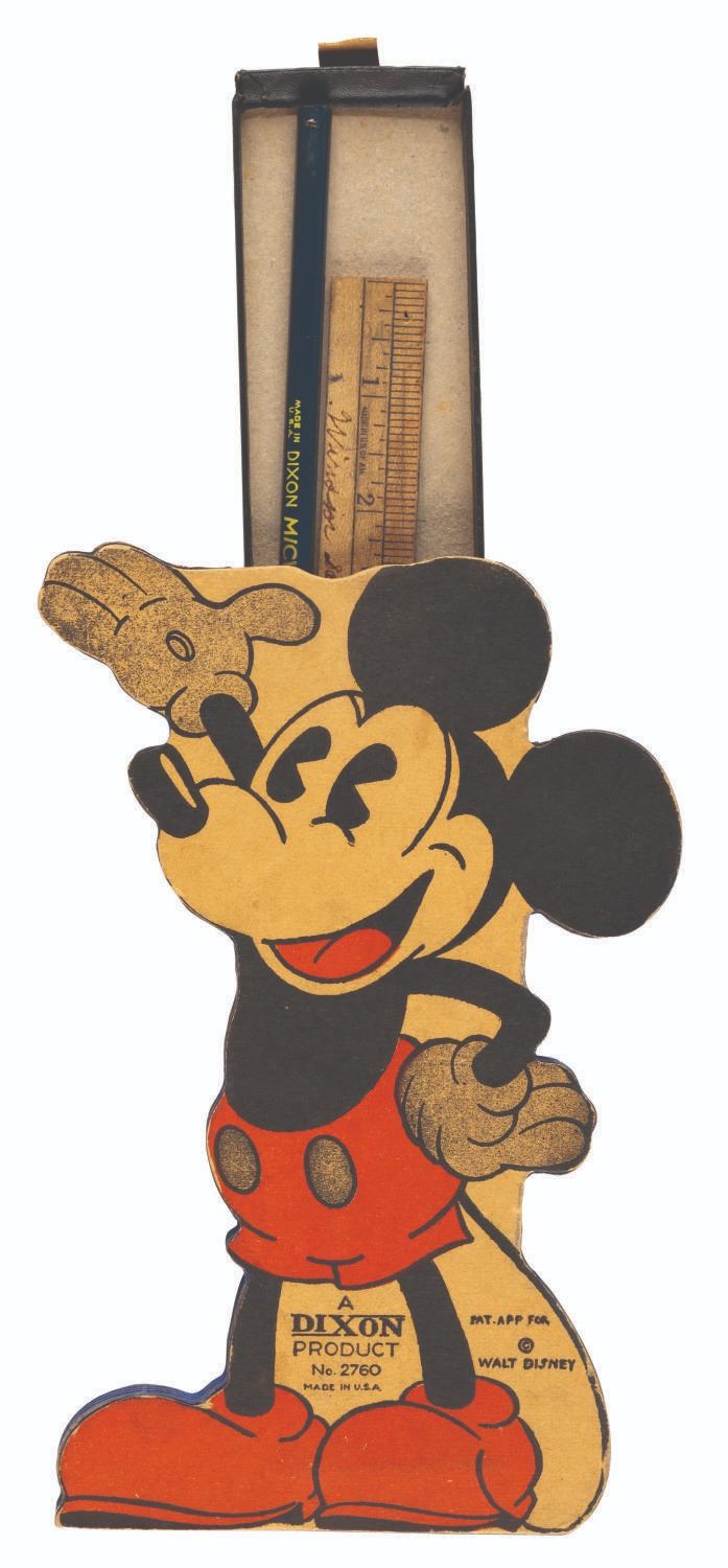 (Dixon, 1930s) A die-cut figural Mickey Mouse pencil case No. 2760 manufactured by Dixon. The case includes a "Mickey Mouse" pencil and 6" ruler. Measuring 5" x 8.5", the pencil box is in very good condition with light wear and discoloration from age, and a name written on one side. The ruler is in fair condition with wear from use and a name written on it, and the pencil is in fine unused condition.
