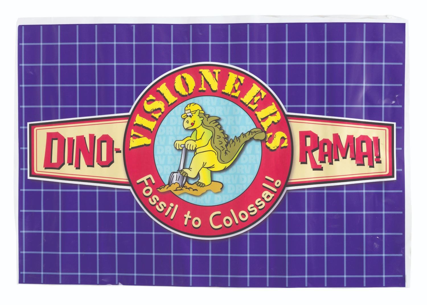 (Disney's Animal Kingdom, 2000s) A large construction decal from the Dino-Rama! area of DinoLand U.S.A. The area was designed to look like a roadside tourist trap featuring carnival-style rides and games. This opening day land is set to become extinct in 2026, when it will be replaced with a Tropical America land. Measuring 25" x 37", the decal is in good condition with scuffs, irregular trimming along the left edge, folds from storage, and some peeling off the backing.