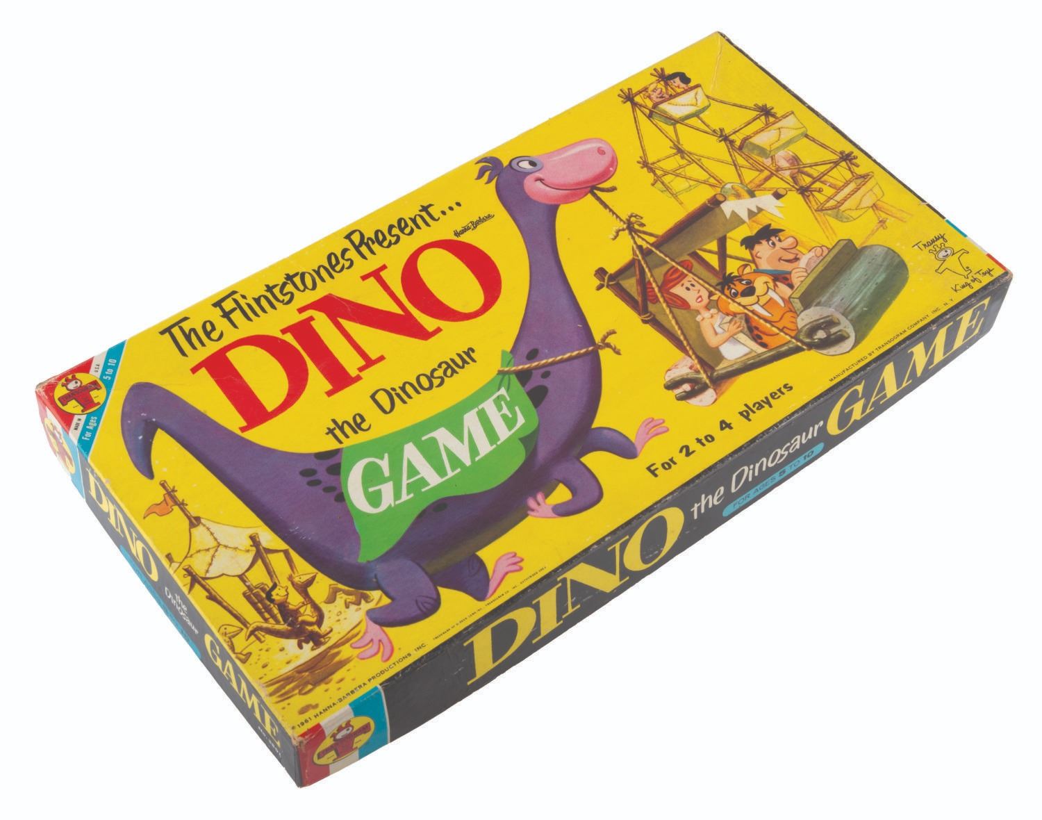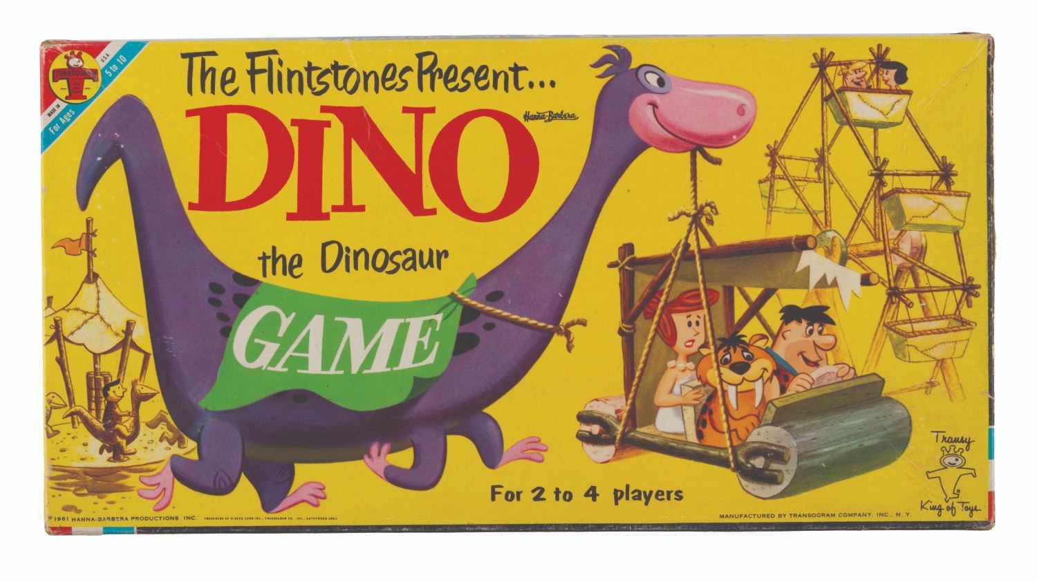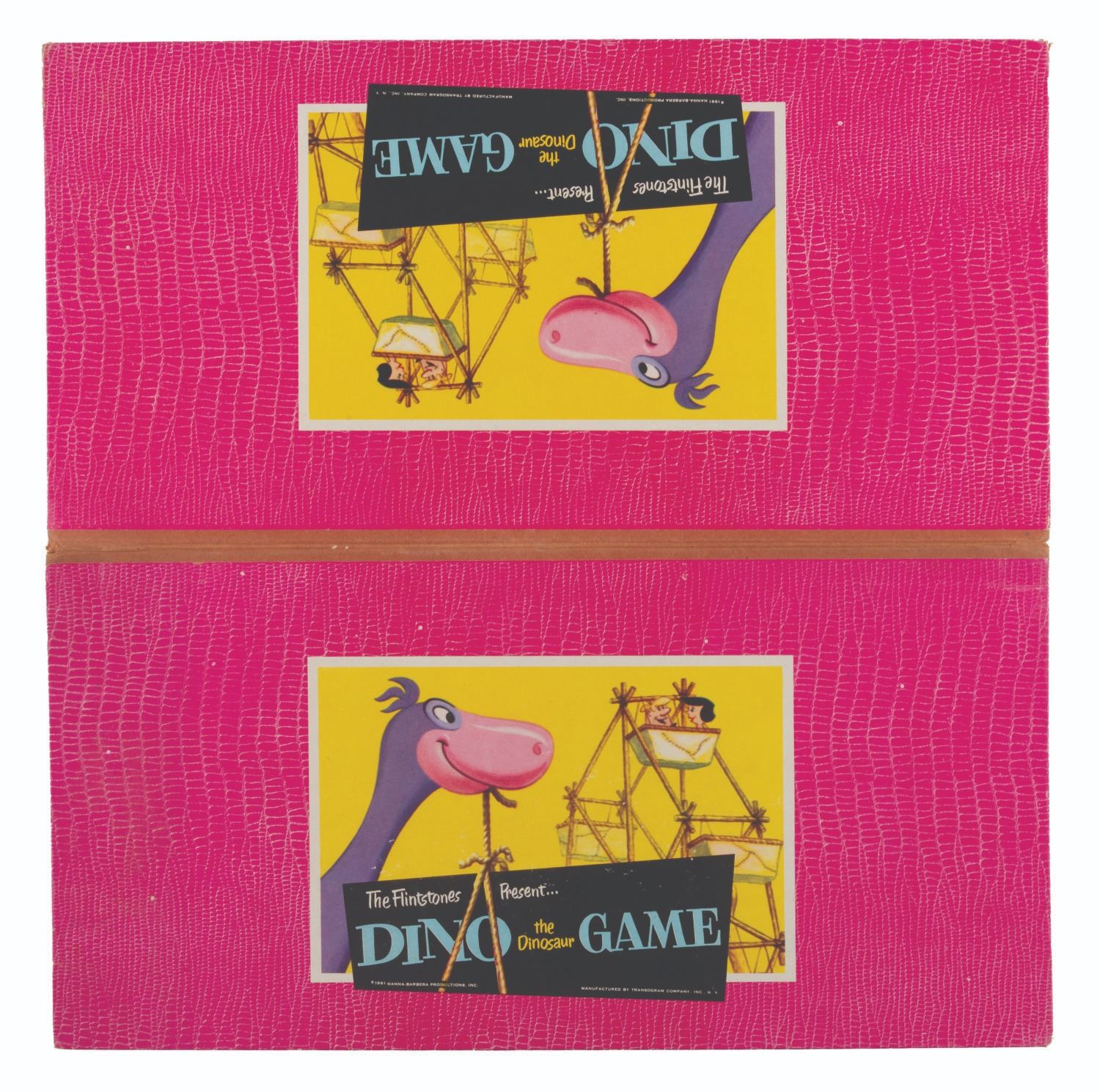 (Transogram, 1961) A colorful “The Flintstones” Dino the Dinosaur game box, board, and instructions, with all other game pieces missing. The 14.75” x 14.75” game board and 4.5” x 8” instructions are in fair to good condition with wear, and creasing, and discoloration from age and pencil notations to the instructions. The 15” x 7.75” x 1.75” original game box is in good condition with wear and creasing.