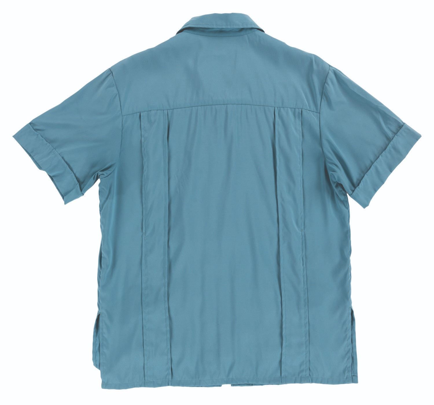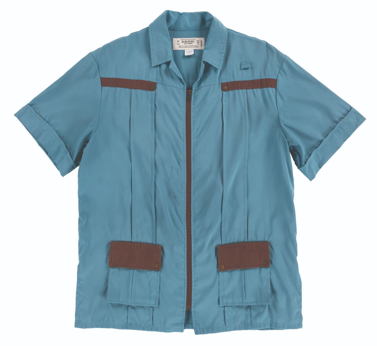(Disney's Animal Kingdom, 1998-2000s) A costume zip-up blue shirt with brown trim, worn by Cast Members working in DinoLand U.S.A. Labeled a male size S, the shirt is in good condition with discoloration from age, a stain in the middle, and wear from Park use.