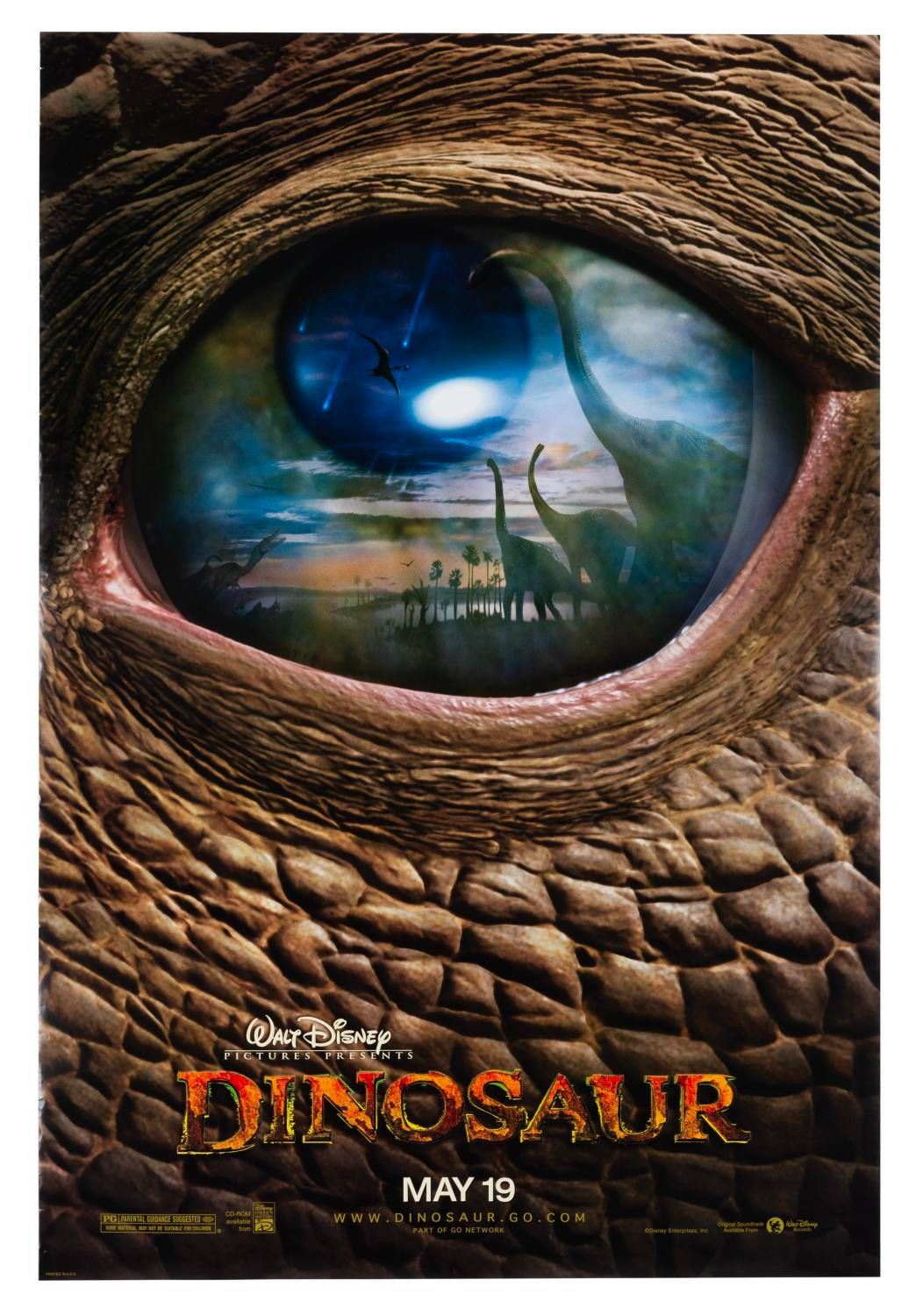 (Disney, 2000) A one-sheet for the original release of "Dinosaur." Measuring 27" x 40", the poster displays in very good condition with creases, scratches, and edge wear.