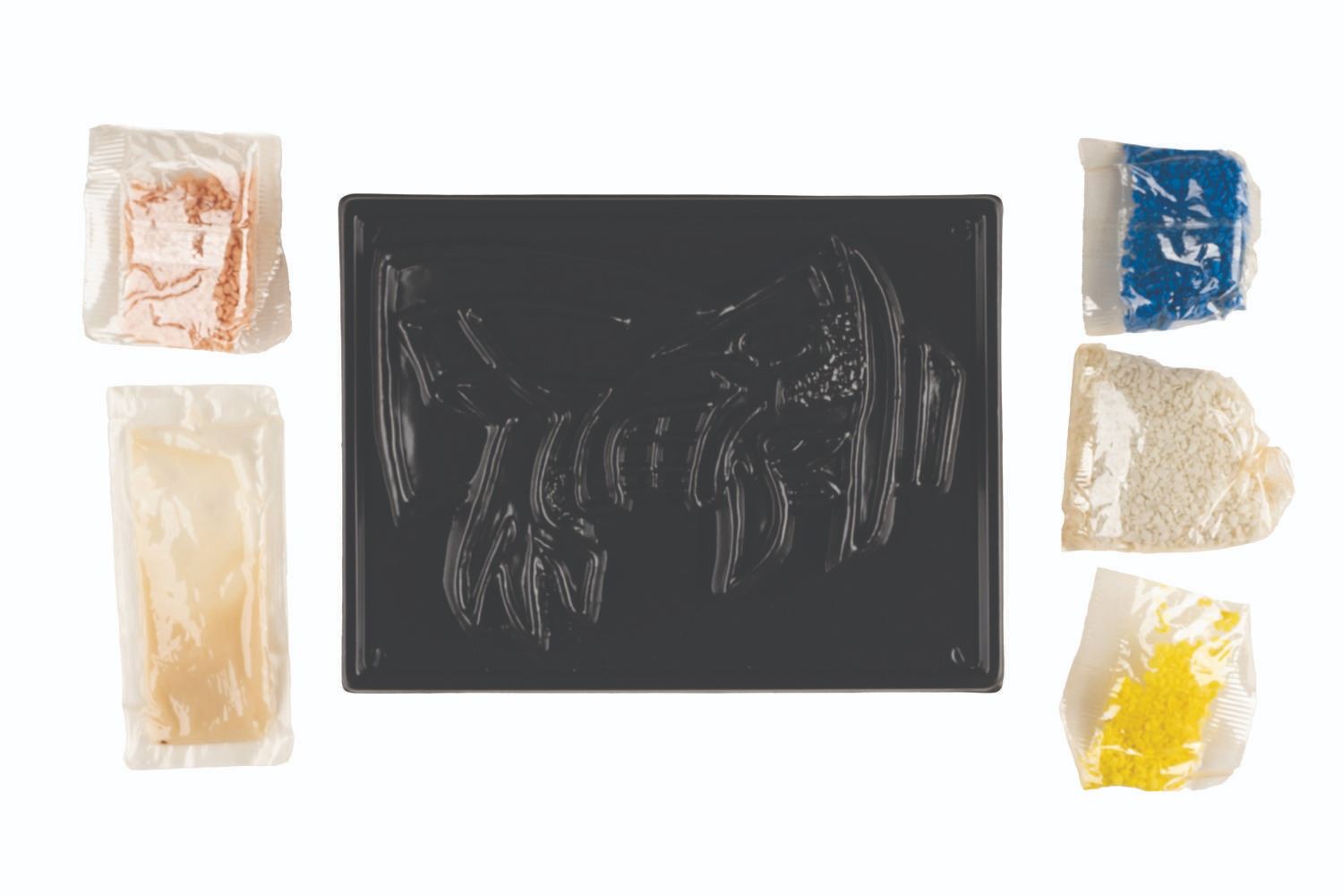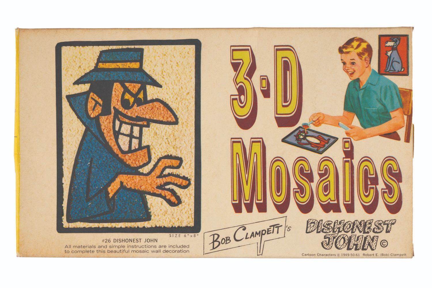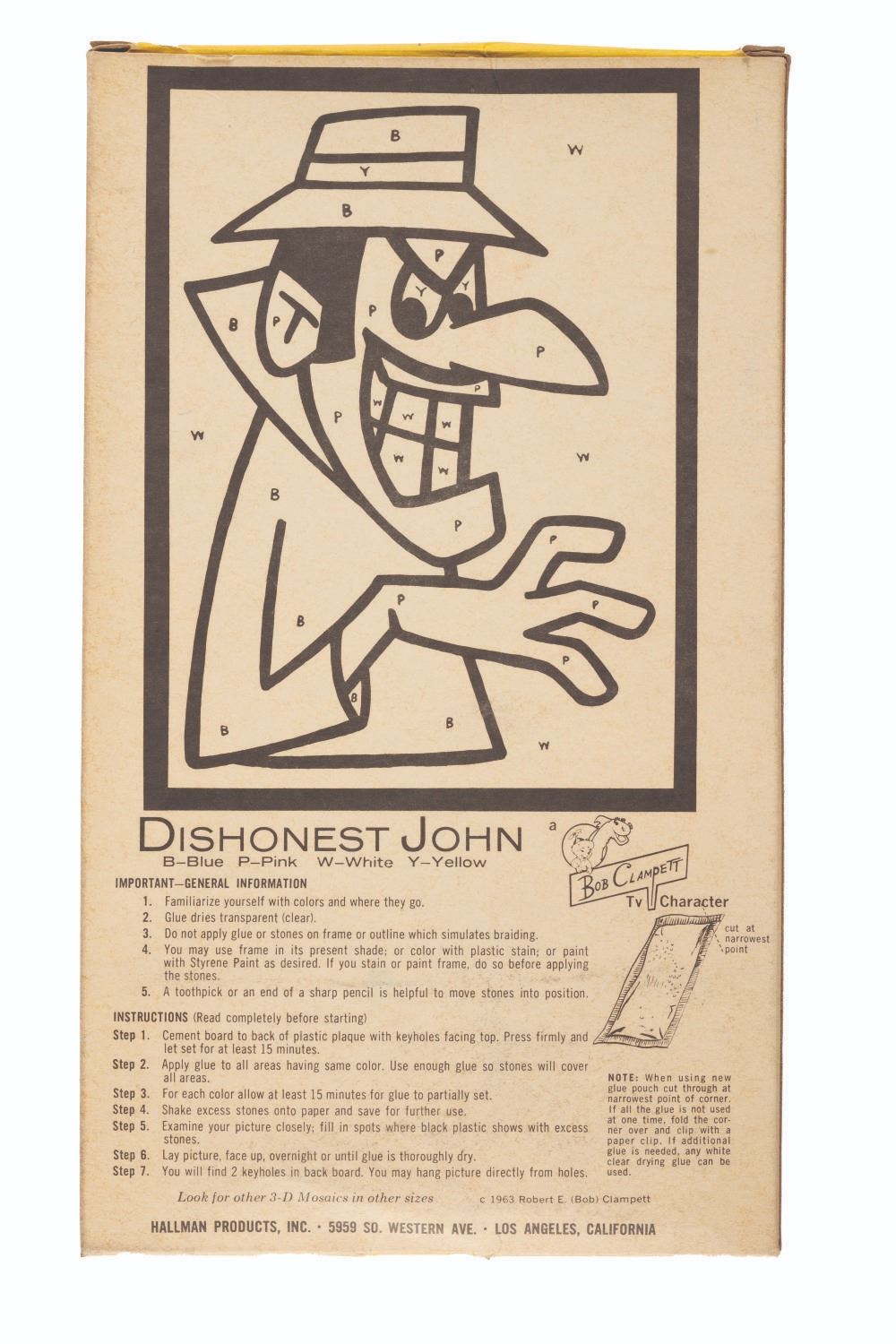 (Hallman Products, 1960s) A complete 3-D Mosaics craft kit with colored stones, glue, and instructions to create a wall decoration of Dishonest John. Measuring 6.25” x 10.5” x 1.25” deep, the unused contents are in very good condition, while the box displays in very good condition with shelf wear and light discoloration from age.