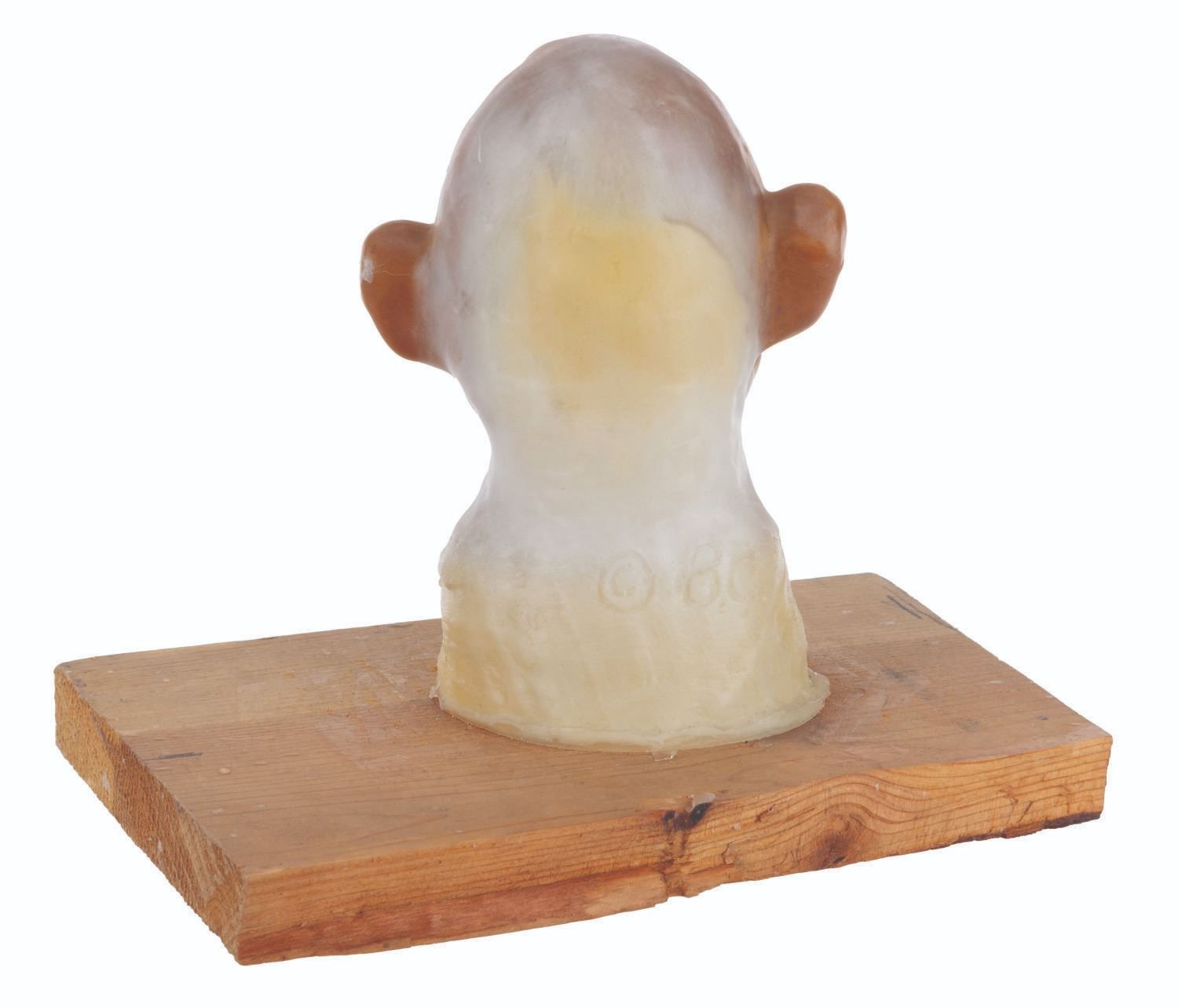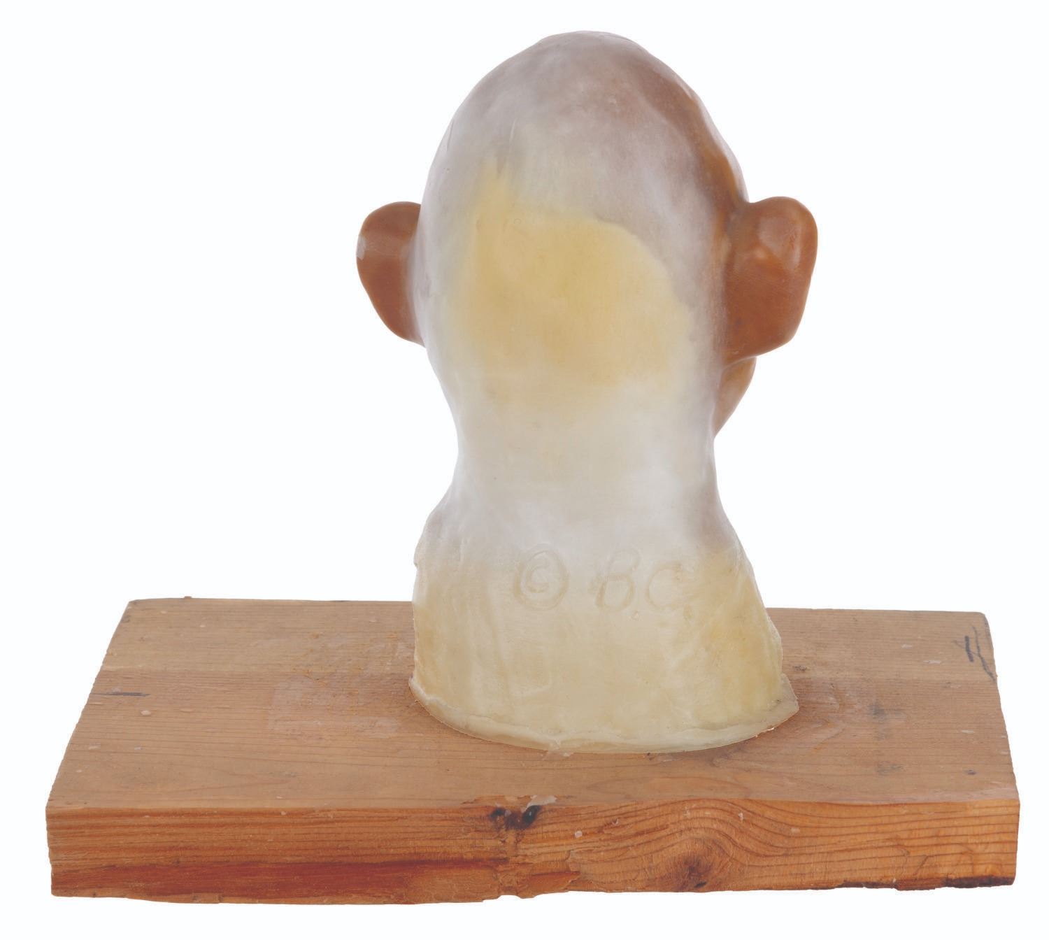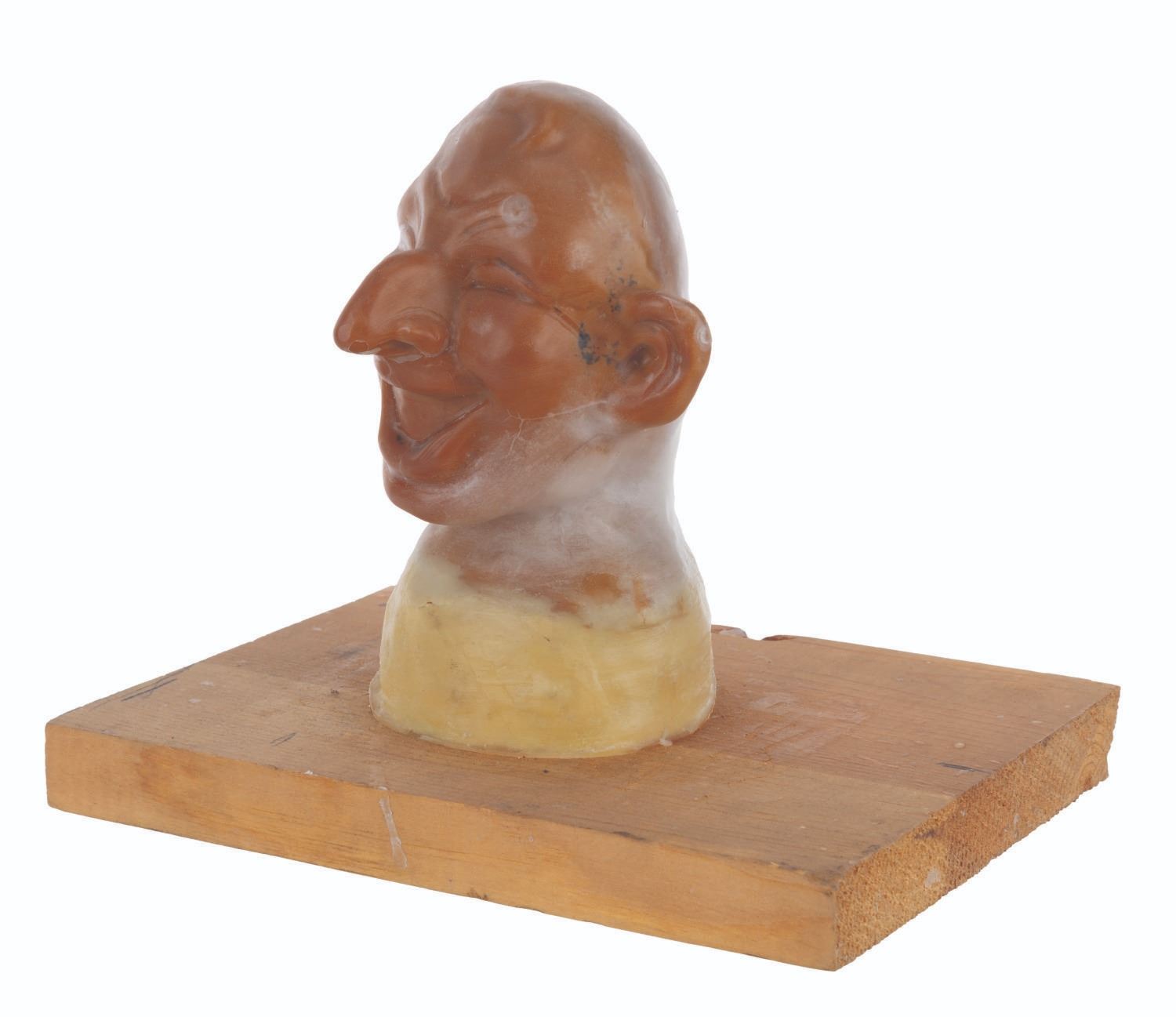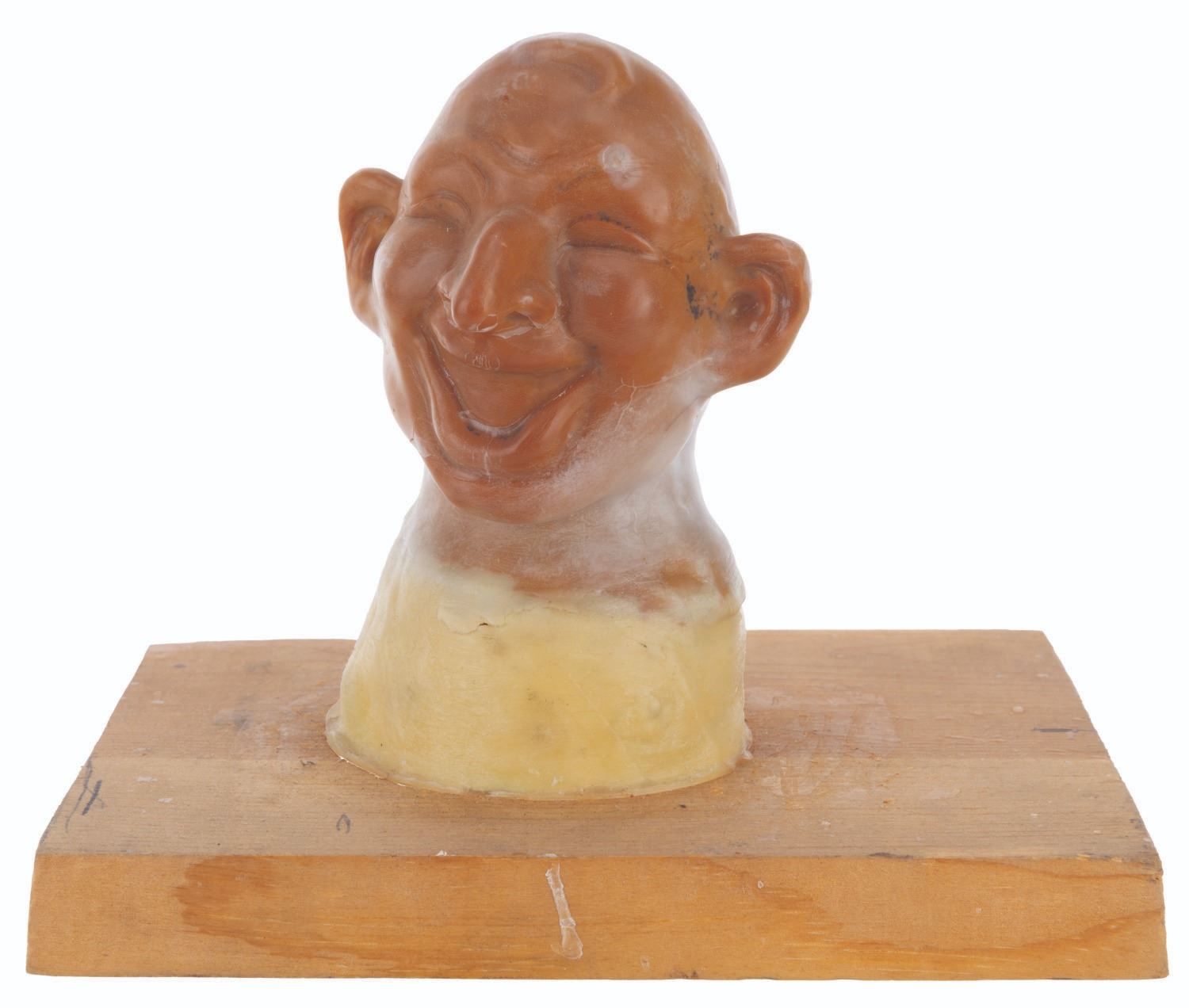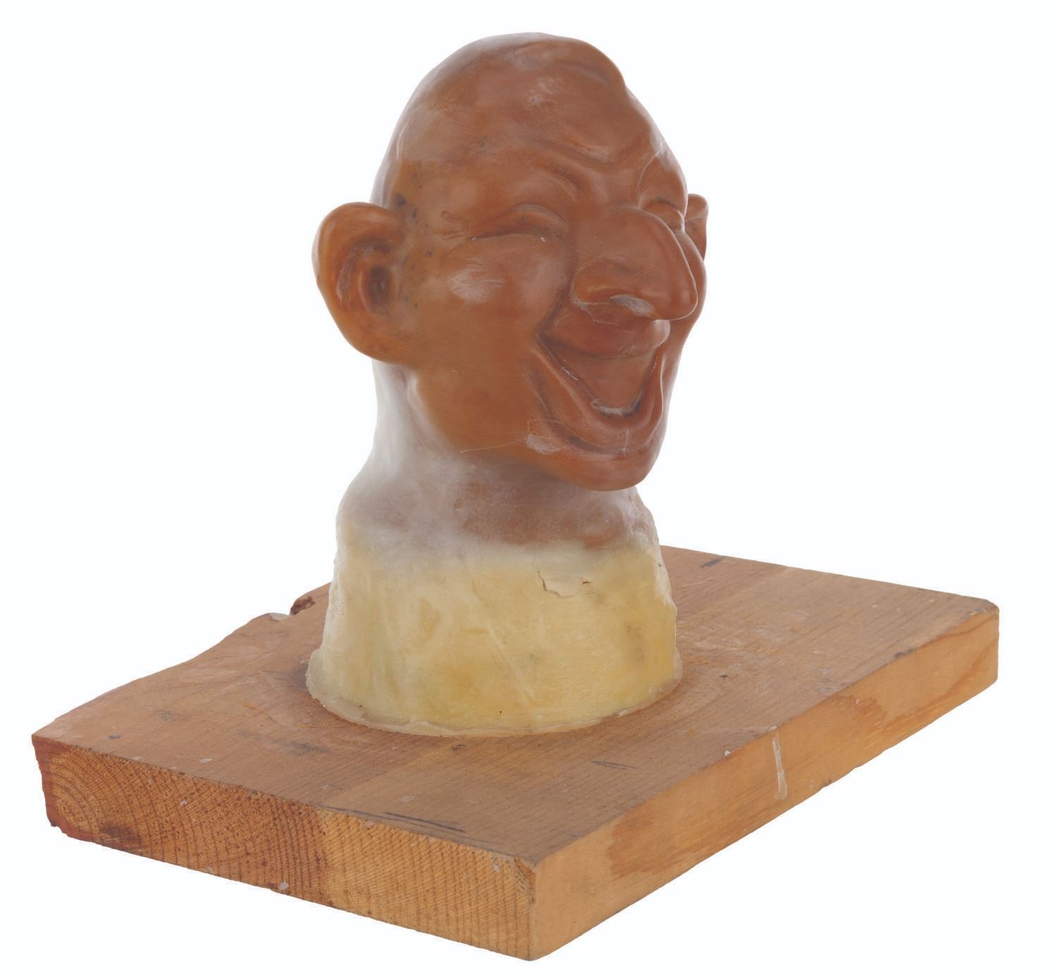 (Clampett, 1949-55) An original, production-used Dishonest John wax sculpt used to create the rubber head of the puppet in “Time for Beany.” The sculpture is marked with a Bob Clampett copyright on the back and its creation is attributed to Bill Oberlin who would go on to collaborate with Clampett on his future project, “Thunderbolt the Wondercolt.” Measuring 5.25” x 3.5” x 3” deep, the head displays in very good, production-used condition and has been mounted to a wooden base which measures 5.25” x 7.25” x 0.5” tall and displays in good, production-used condition with chips, wax residue, wear from production use.