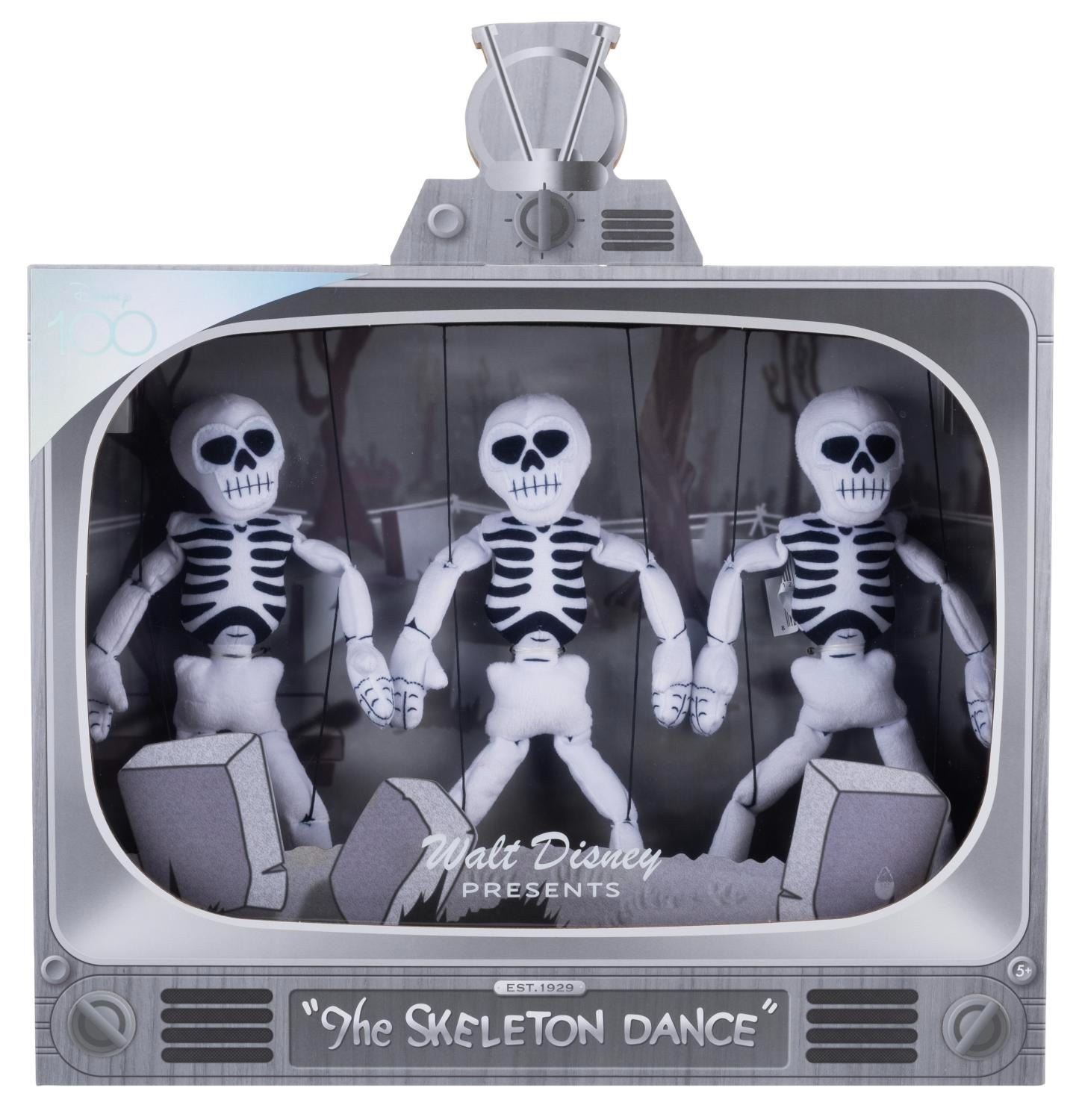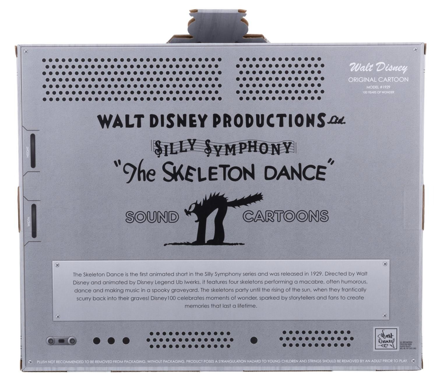 (Disney, 2023) A three-skeleton plush set based on "The Skeleton Dance" Silly Symphony, part of the Disney 100 collection. When the top of the box is pulled, the skeletons dance. Measuring 16" x 6" x 13" tall, the skeletons are in fine condition, while the box is in very good condition with light scratches and wear.