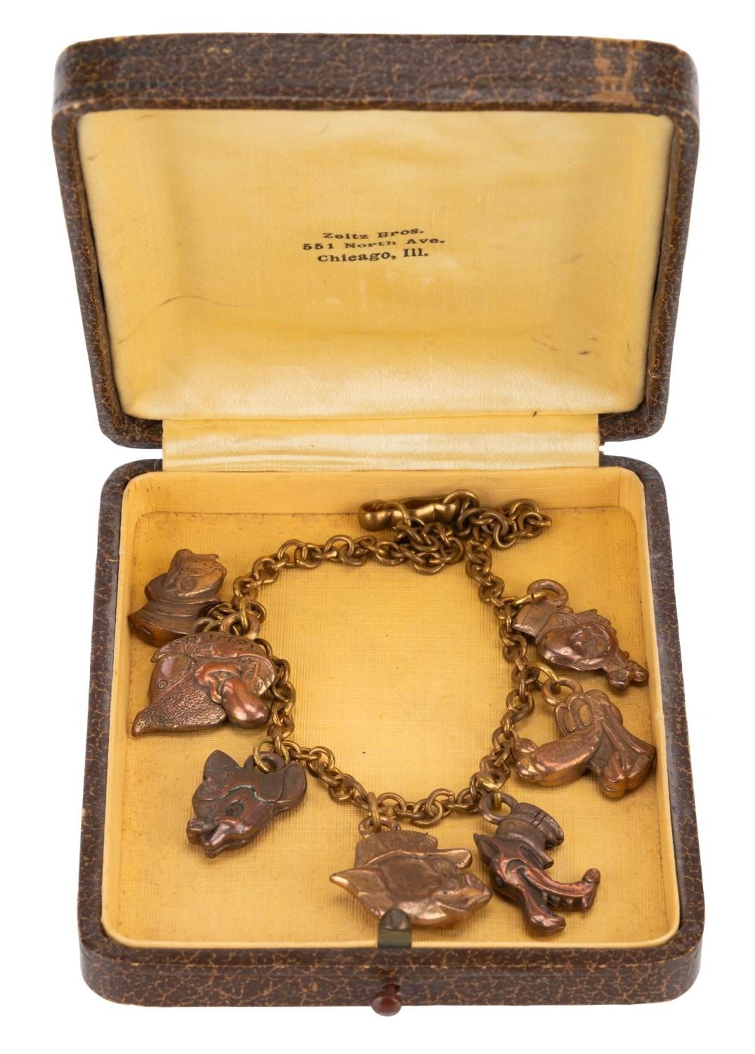 (Disney, 1940s) A gold-toned charm bracelet and protective case featuring Grumpy, Jiminy Cricket, Bambi, Practical Pig, the Big Bad Wolf, Pluto, and José Carioca. Measuring 10.25" in length, the bracelet is in very good condition with oxidation.