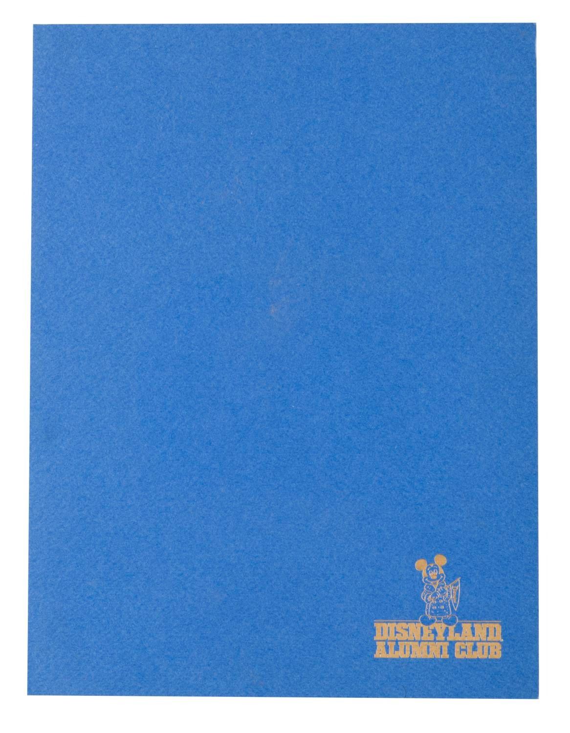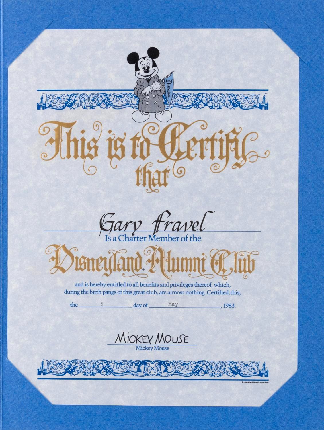 (Disneyland, 1983) A Disney Alumni Club certificate addressed to member Gary Fravel and dated May 05, 1983. The impressive certificate features embossed gold foil and comes in a blue display folder. Measuring 9.5” x 12.5”, the piece is in fine condition.