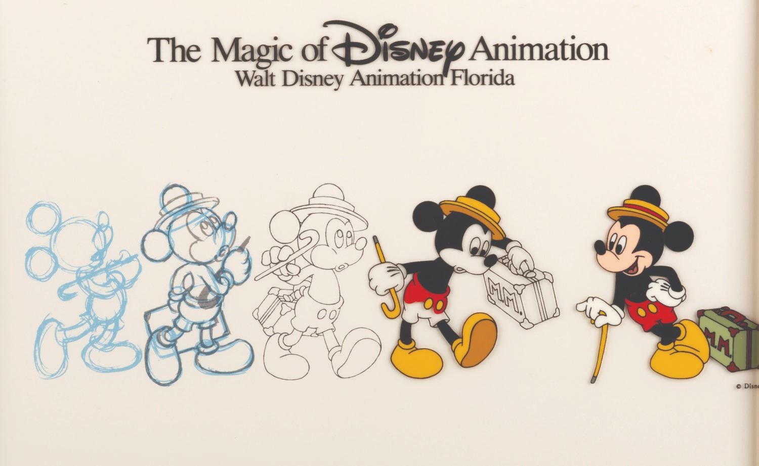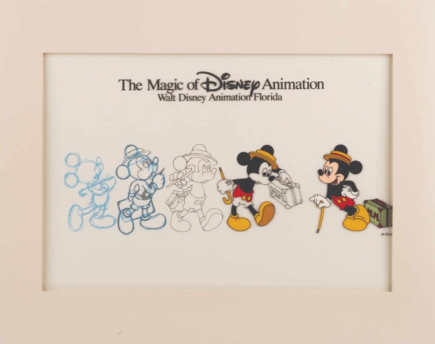 (Disney/MGM, 1989) A “Progressive Mickey” cel from the Magic of Disney Animation Tour illustrating the main steps in the traditional animation process. Three drawings on the background show Mickey in rough, detail, and clean-up drawn stages, and the sericel features Mickey Mouse in the Xerographic and final painting steps. This piece comes with a two-page description of the process illustrated. The image measures 3" x 10.25" on a 10.5" x 13" cel which is in fine condition with some very minor smudges towards the top right. The 8.5” x 11” description is in good condition with some wear and spotting.
