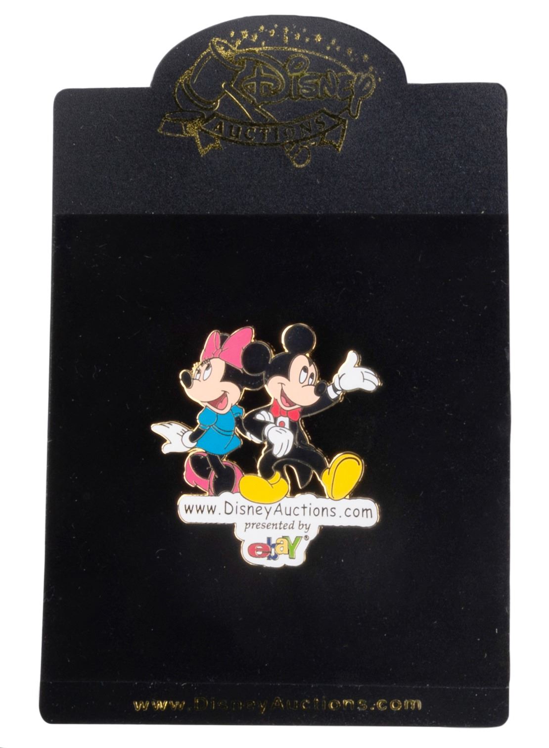 (Disney, 2000s) A collection of nine DisneyAuctions.com pins featuring Mickey and Minnie, Sulley, Queen of Hearts, Tinker Bell, Stitch, Scrooge, Marie, Sorcerer Mickey, and Captain Hook with Mr. Smee. The pins are in very good condition on their original cards.
