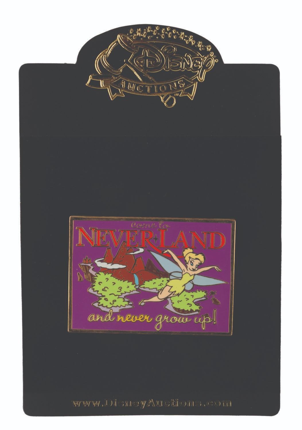 (Disney, 2003) A Disney Postcard Collection pin of Tinker Bell in Never Land, released by Disney Auctions in a very limited edition of only 100. Only 25 were available individually, with the rest sold in 75 complete sets of the six different oversize postcard pins. Measuring 1.75 " x 2.5 ", the pin is in fine condition on the original card.