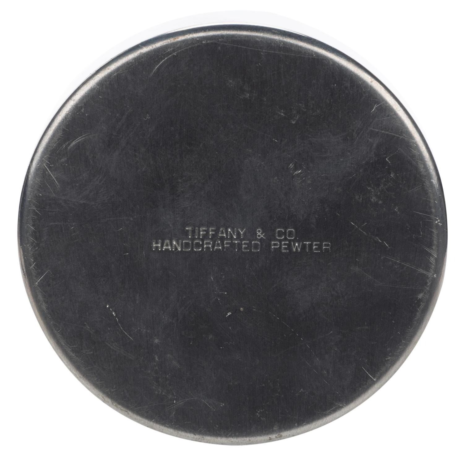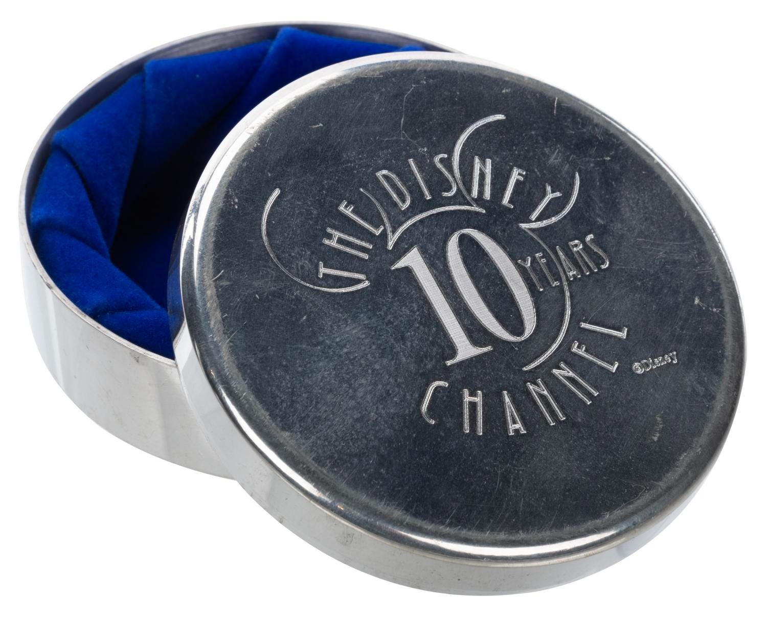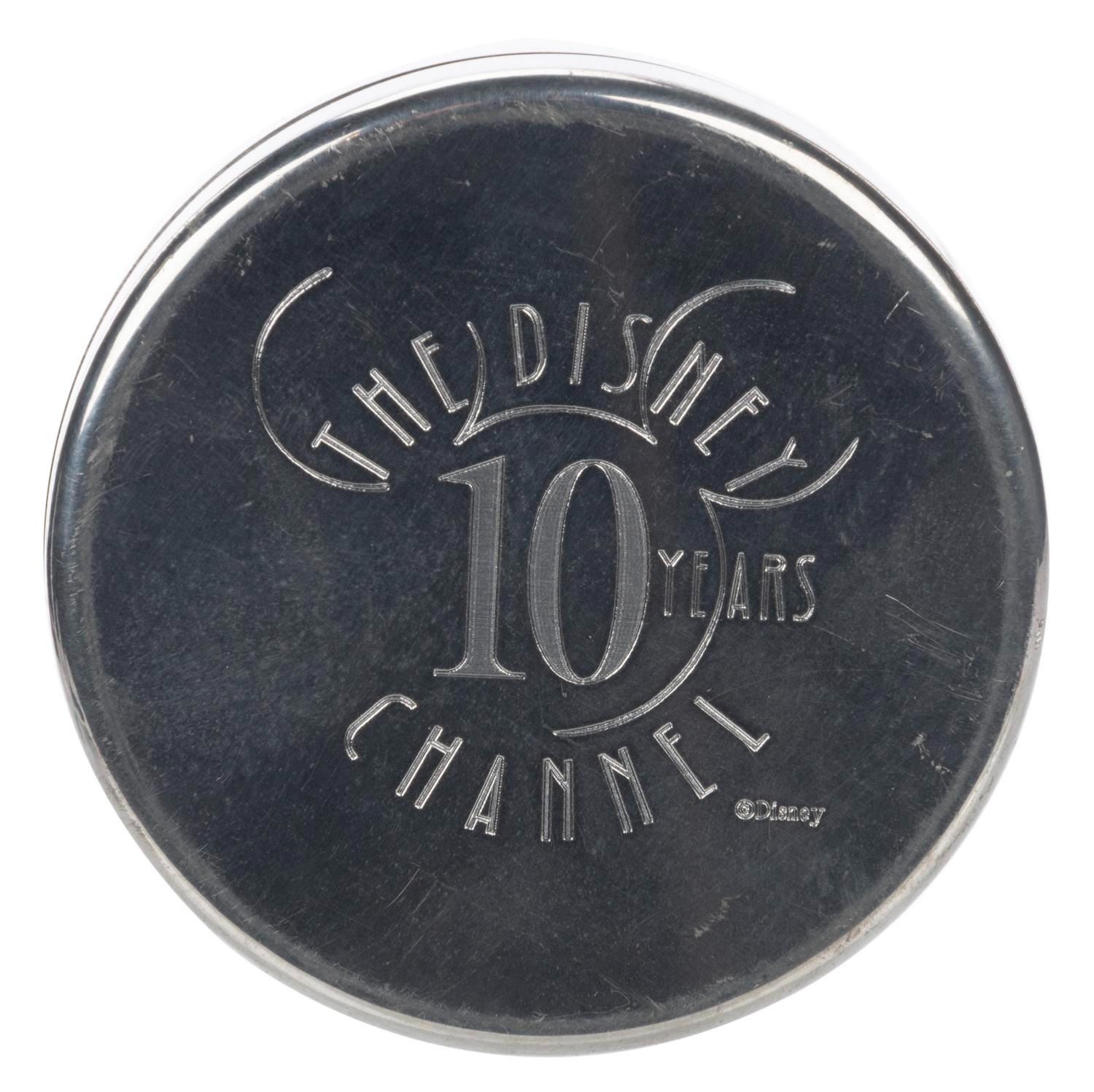 (Tiffany and Co., 1993) A velvet-lined Tiffany and Co. pewter trinket box commemorating The Disney Channel's 10 year anniversary. Measuring 3" in diameter and 1" tall, the box is in good condition with light scratches.