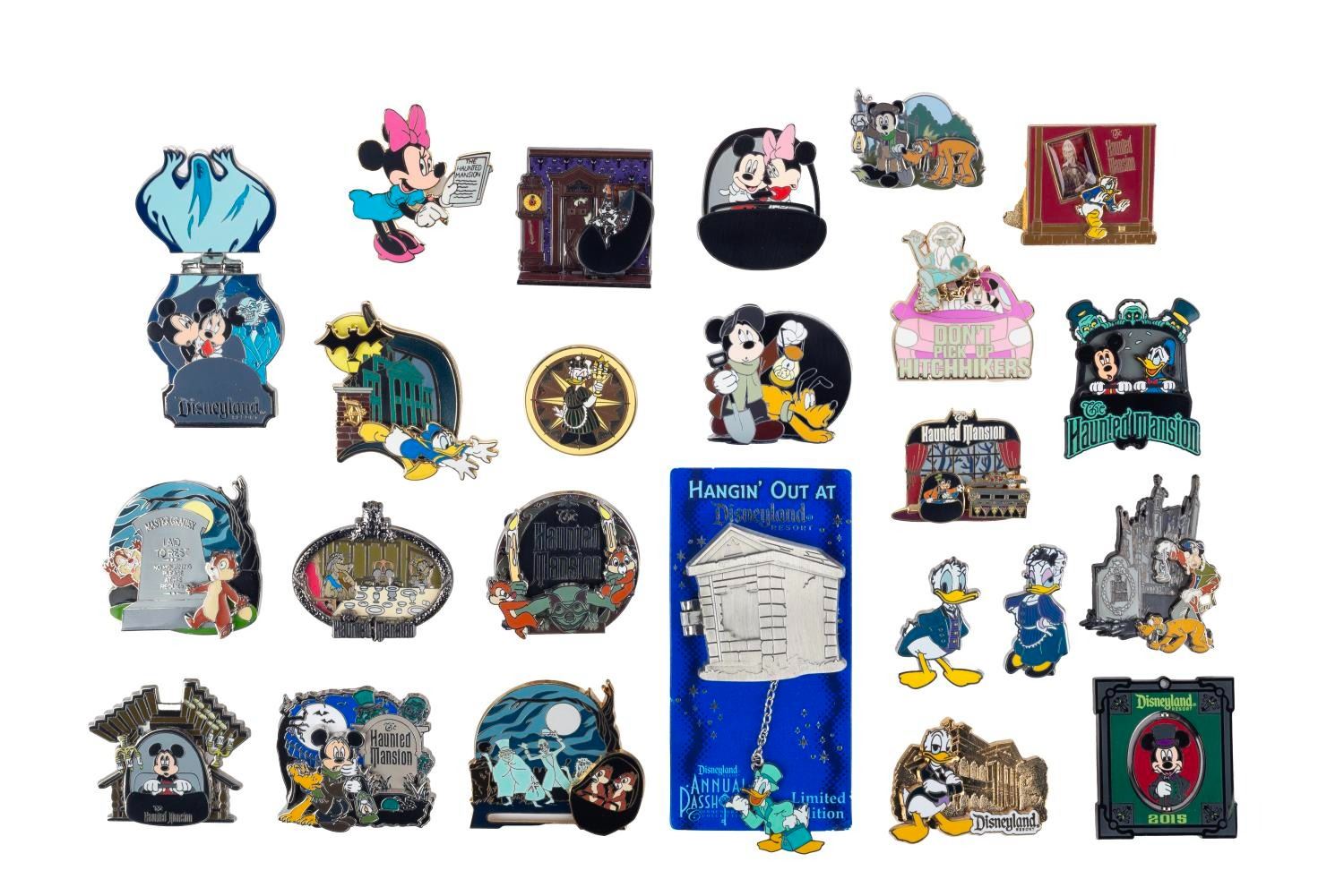 (Disney Parks, 2003-15) A large collection of 24 Haunted Mansion pins featuring beloved Disney characters. The collection includes Annual Passholder, Cast Member, and Imagineering Exclusive pins. Each pin is in very good to fine condition with the "pin-on-pin" feature of the Chip ‘n Dale Doom Buggy pin detached but retained.