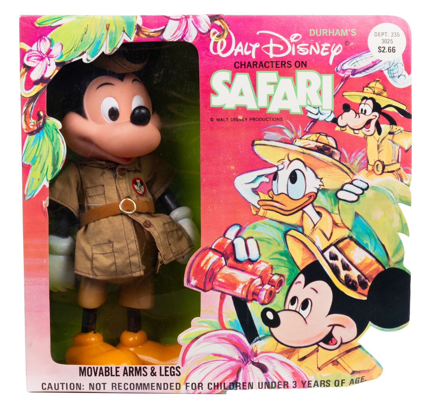 (Durham, 1970s) A Walt Disney Characters on Safari Mickey Mouse with movable arms and legs. The doll was released through Woolworth's department stores. Measuring 9.5" tall, the fine condition figure comes in its original 9.5" x 9.75" x 3.25" very good condition box, exhibiting fading, discoloration, and wear.