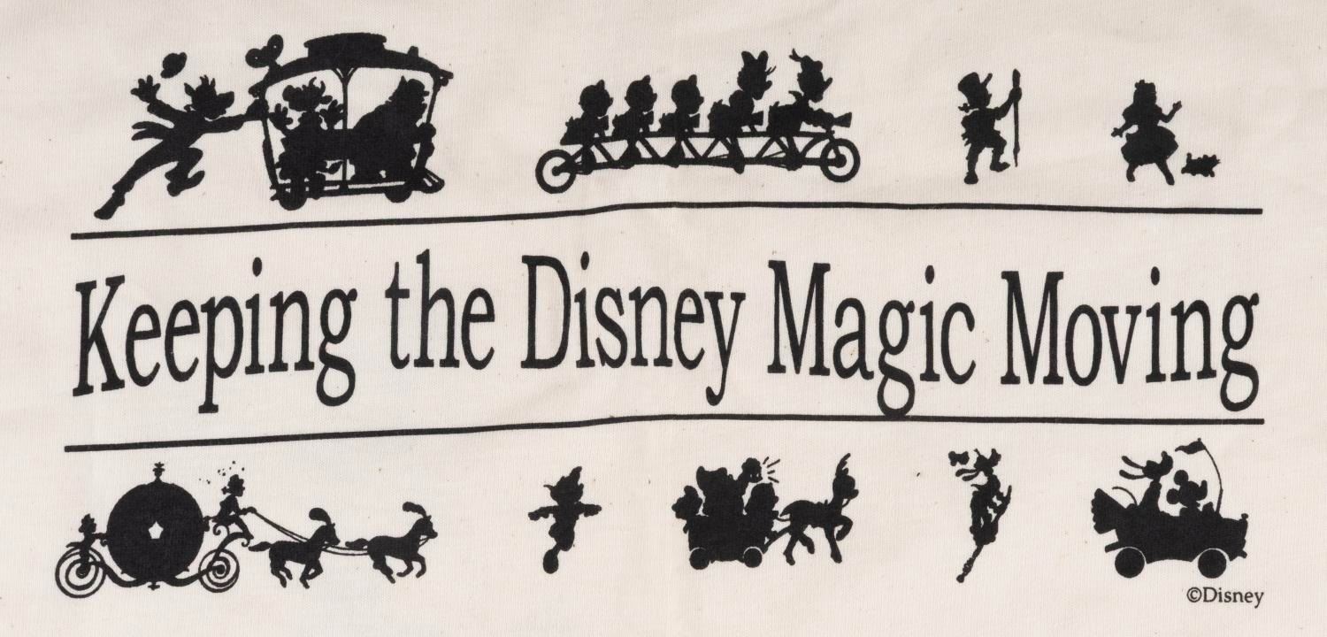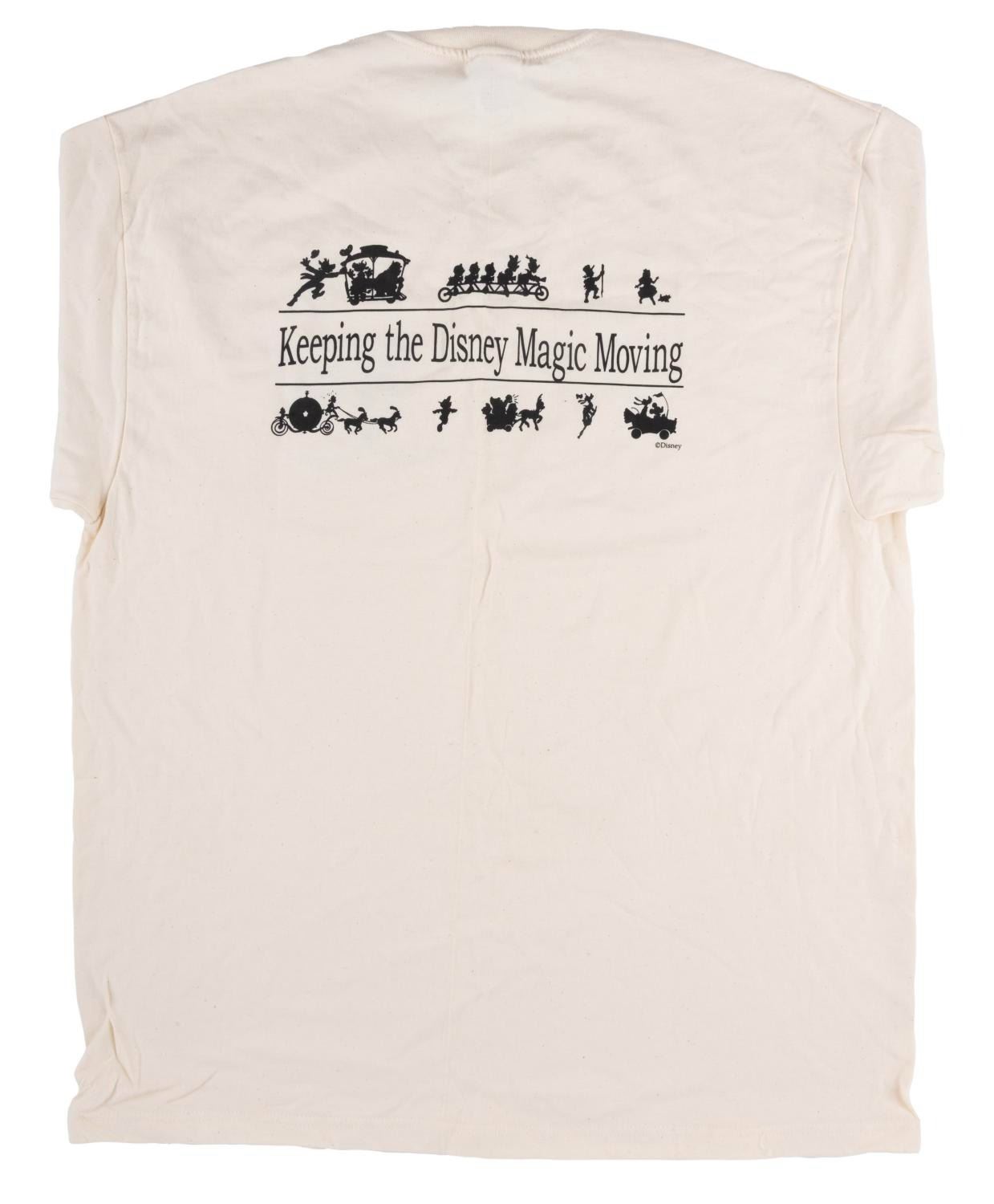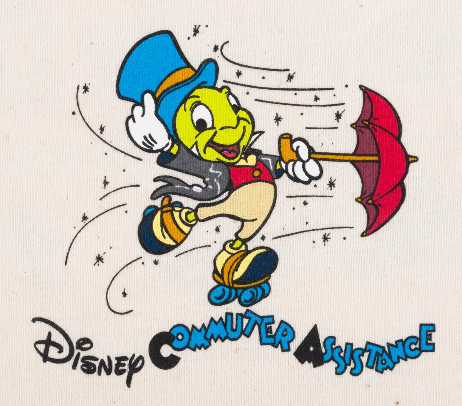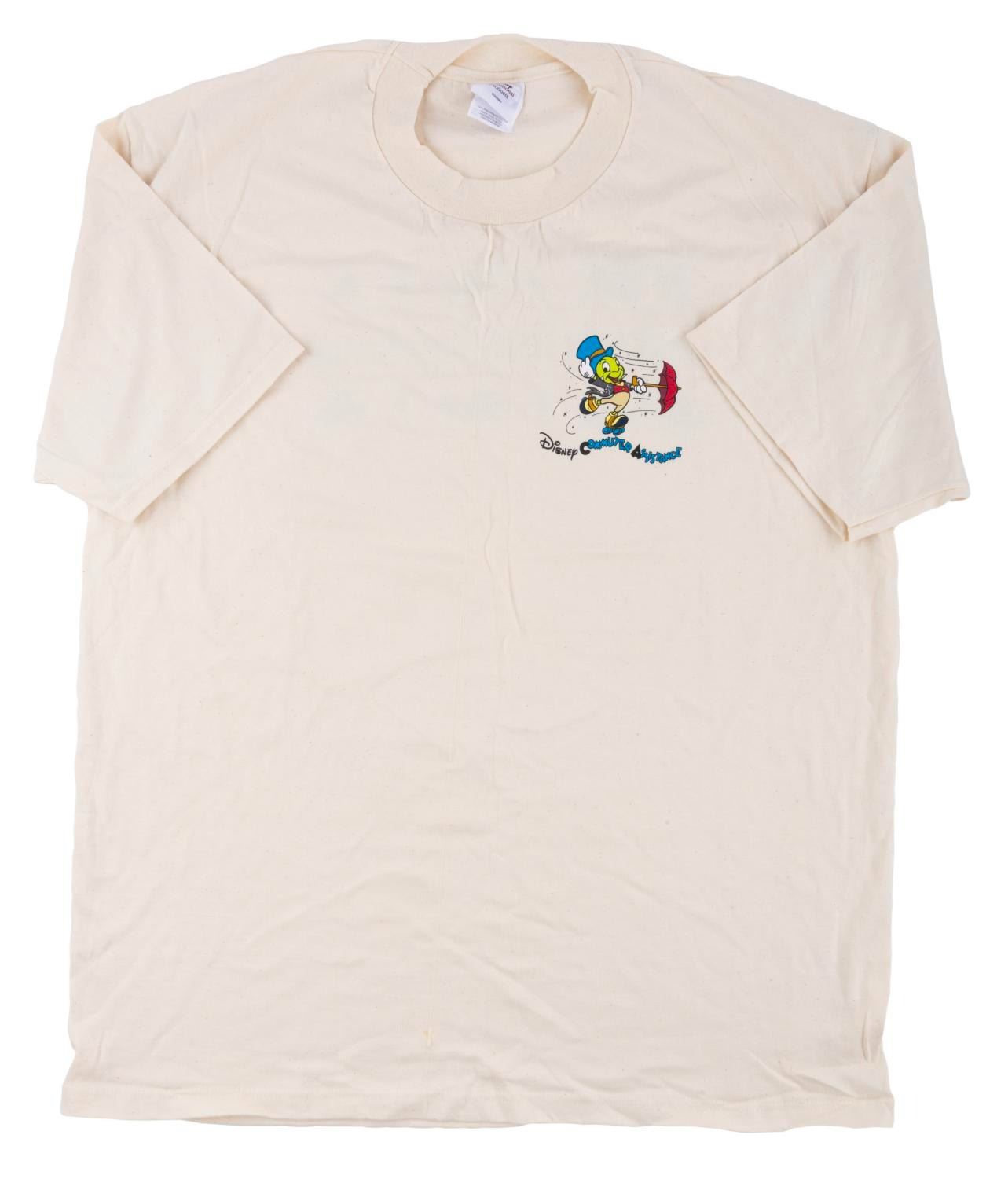 (Disney, 1990s) A T-shirt featuring Jiminy Cricket on the front and Disney vehicles on the back, given to members of the Disney Commuter Assistance team. Labeled a size Adult XL, the T-shirt is in very good condition with light wear.