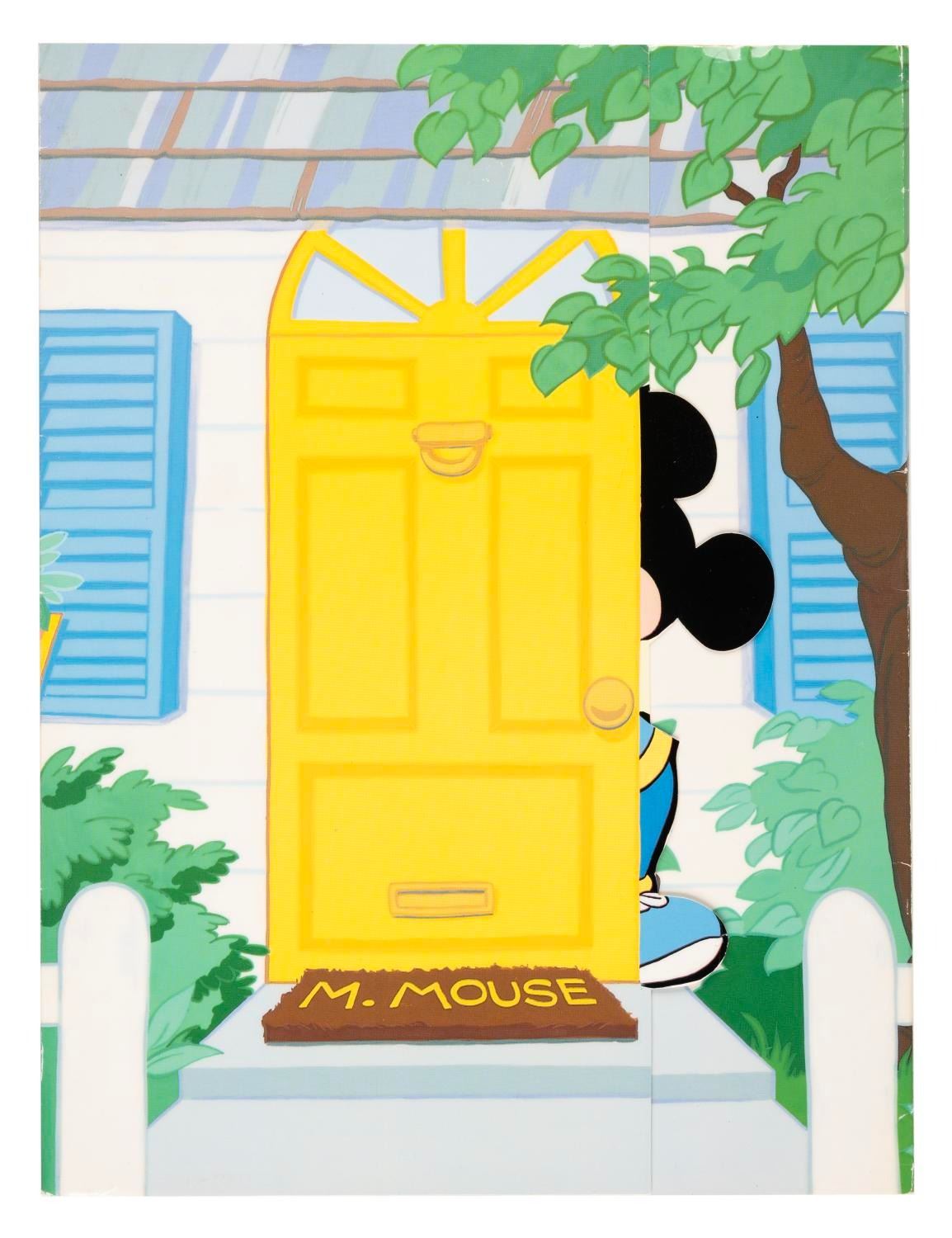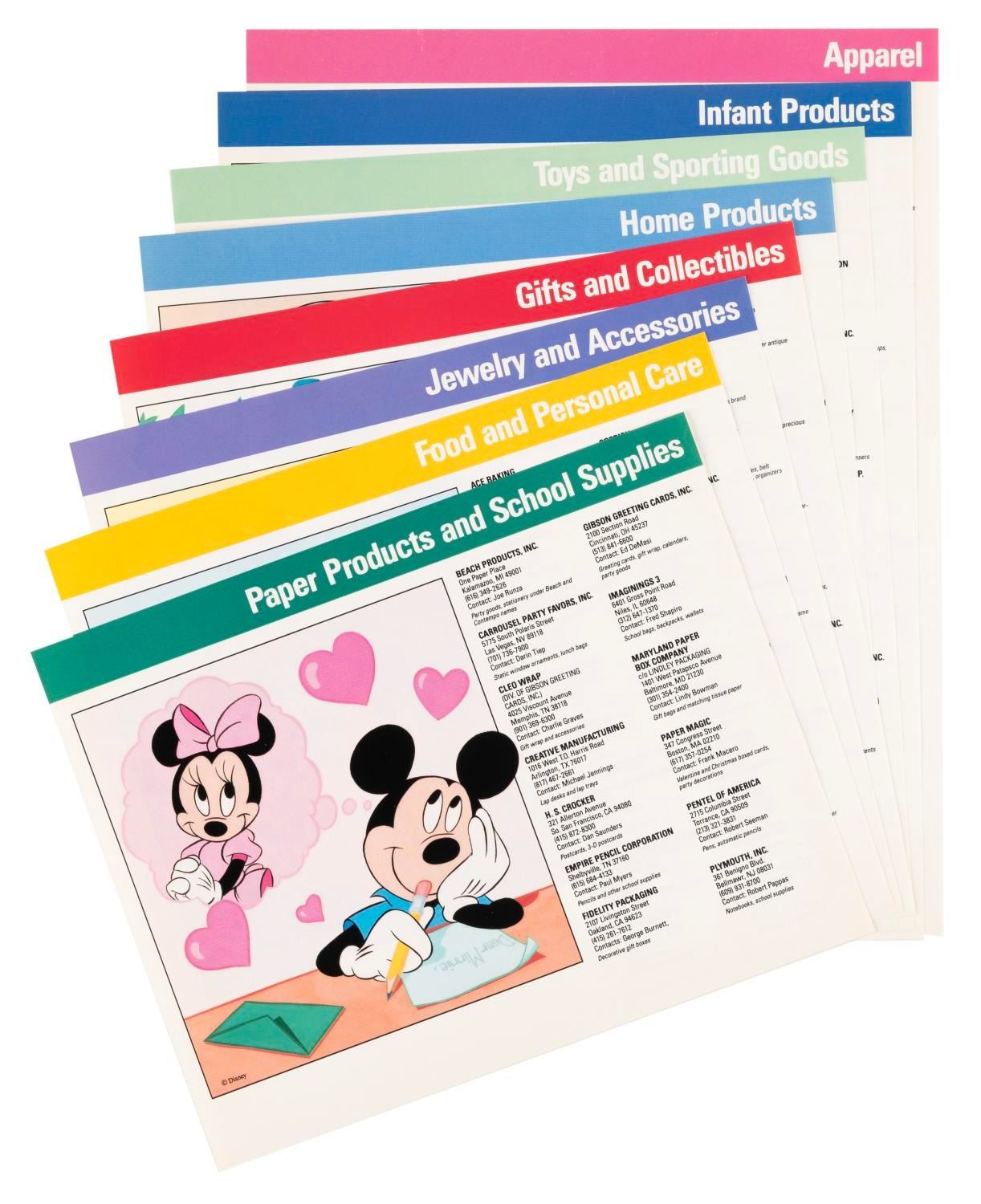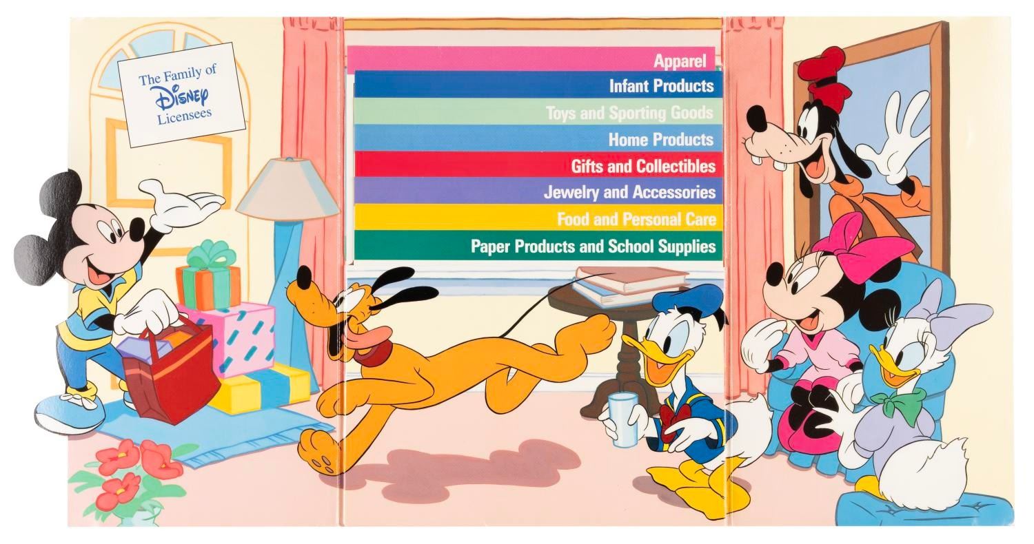 (Disney, 1980s-1990s) A Disney Consumer Products folder containing contact information for "the family of Disney licensees." The corporate contacts are split into the categories of apparel, infant products, toys and sporting goods, home products, jewelry and accessories, and paper products and school supplies. Measuring 9" x 12", 12" x 23.25" opened, the info folder displays in very good condition with light scratches, creases, and edge wear.
