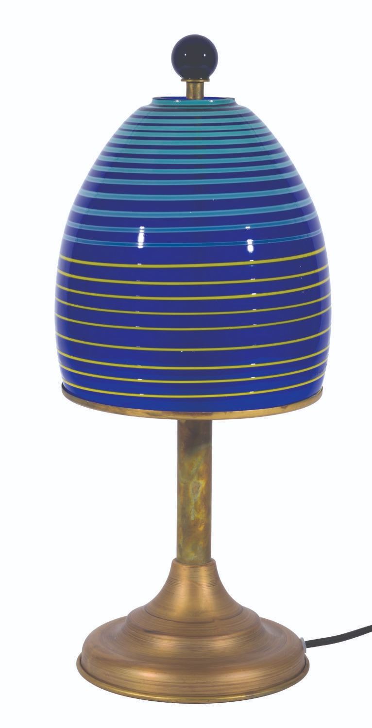 (Disney Cruise, 1998) A rare desk lamp given to supporters of the Disney Wonder, the second ship of the Disney Fleet. This art nouveau-style shade is reminiscent of those that decorated Palo's restaurant, and was manufactured in Murano for pre-opening supporters of the ship. Measuring 18" tall and 7.25" in diameter, the antiqued finish metallic lamp with glass shade is in very good condition, exhibiting slight wear from handling.
