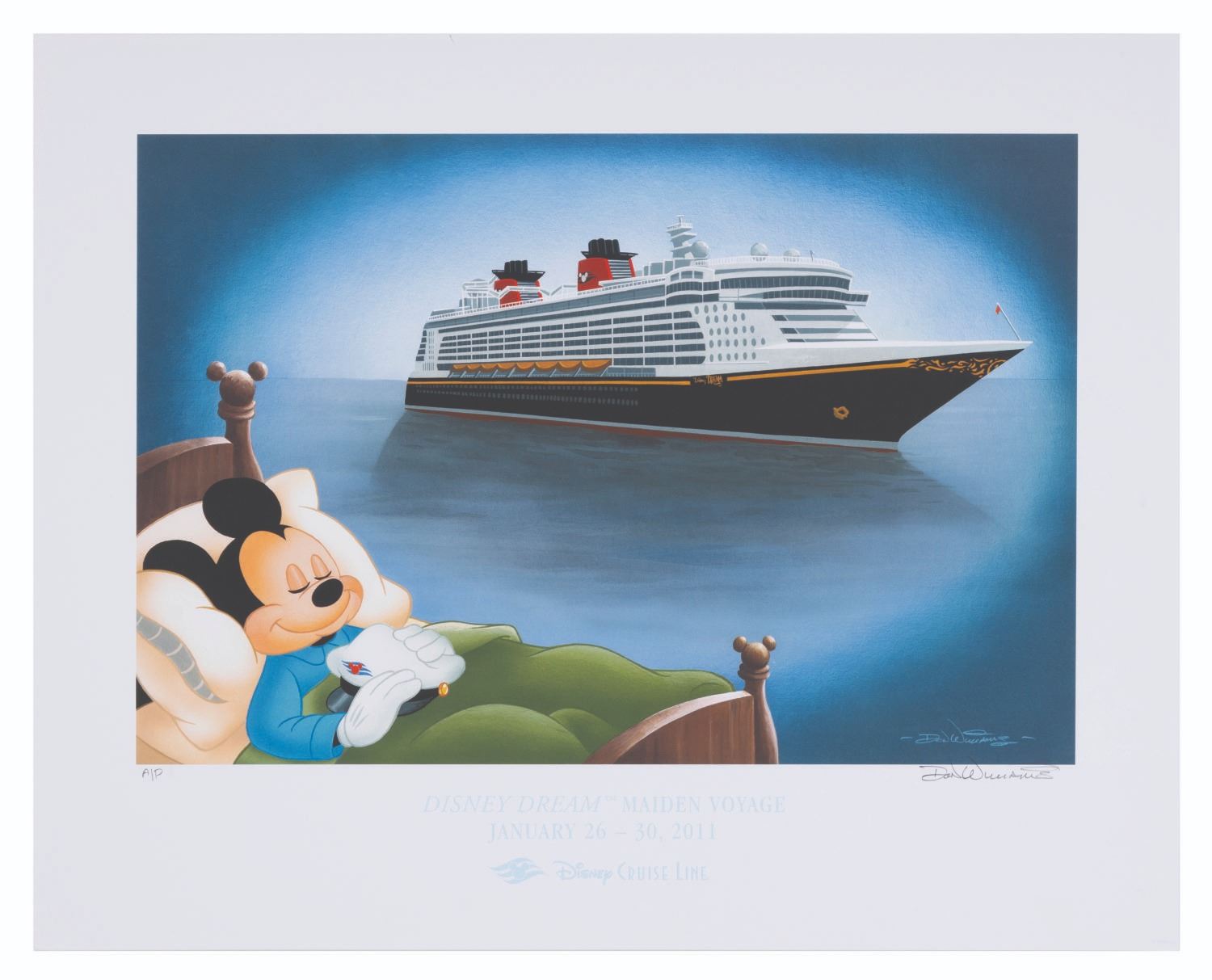 (Disney, 2010) A lithograph of Mickey Mouse and the Disney Dream Cruise Ship. Titled "Mickey's Maiden Disney Dream Cruise," the piece was created to commemorate the ship's maiden voyage in January 2011. Released in a limited edition of only 1,500 plus 50 Artist’s Proofs, this lithograph was signed by the artist Don Williams and marked "AP." With an image size of 11" x 16" on 16" x 20" paper, the art is in fine condition.