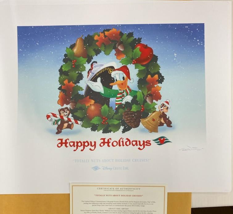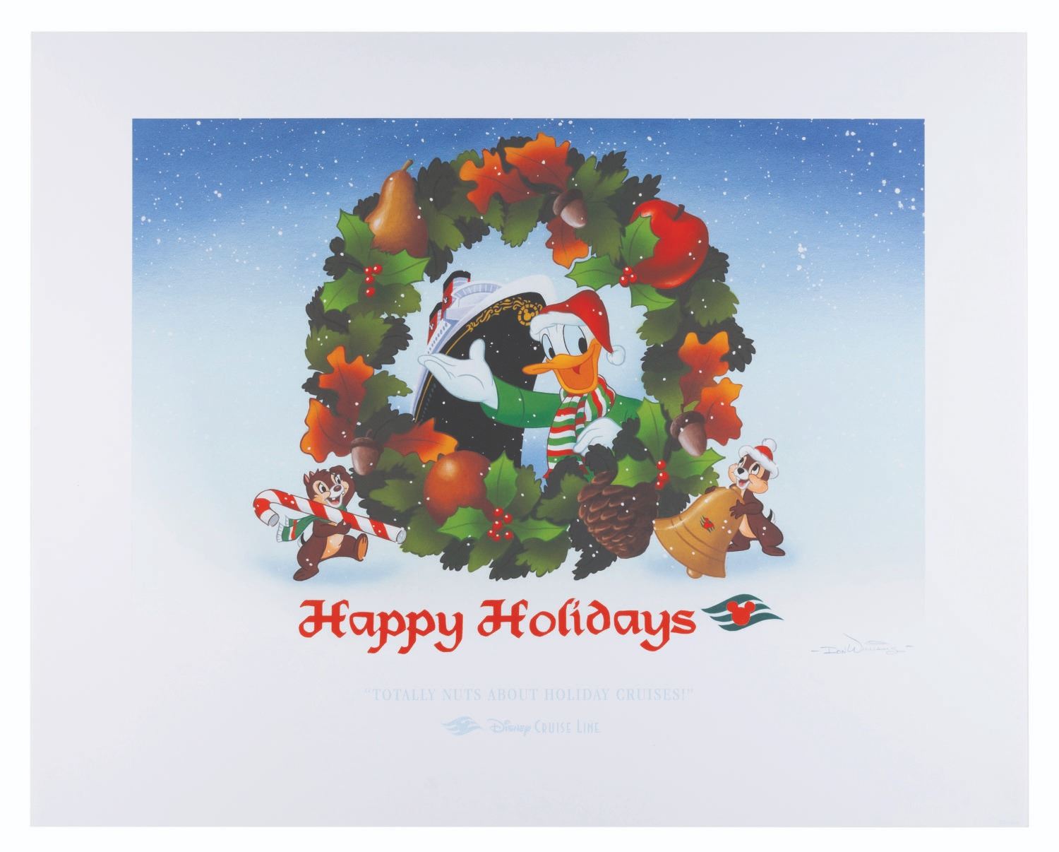 (Disney, 2012) A lithograph of Donald, Chip, and Dale wishing Happy Holidays. Titled"Totally Nuts About Holiday Cruises!," the piece was created to commemorate a Disney Guest’s holiday voyage in 2012. Released in a limited edition of 4,900 plus 50 Artist’s Proofs, this lithograph was created by Don Williams. With an image size of 11" x 16" on 16" x 20" paper, the art is in fine condition.